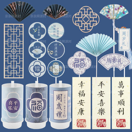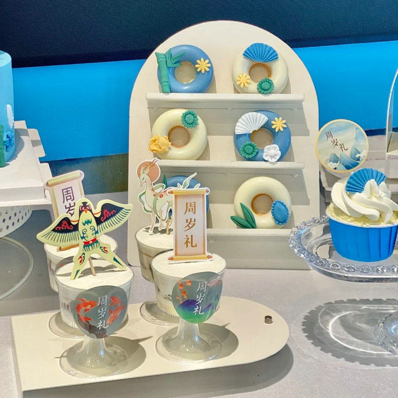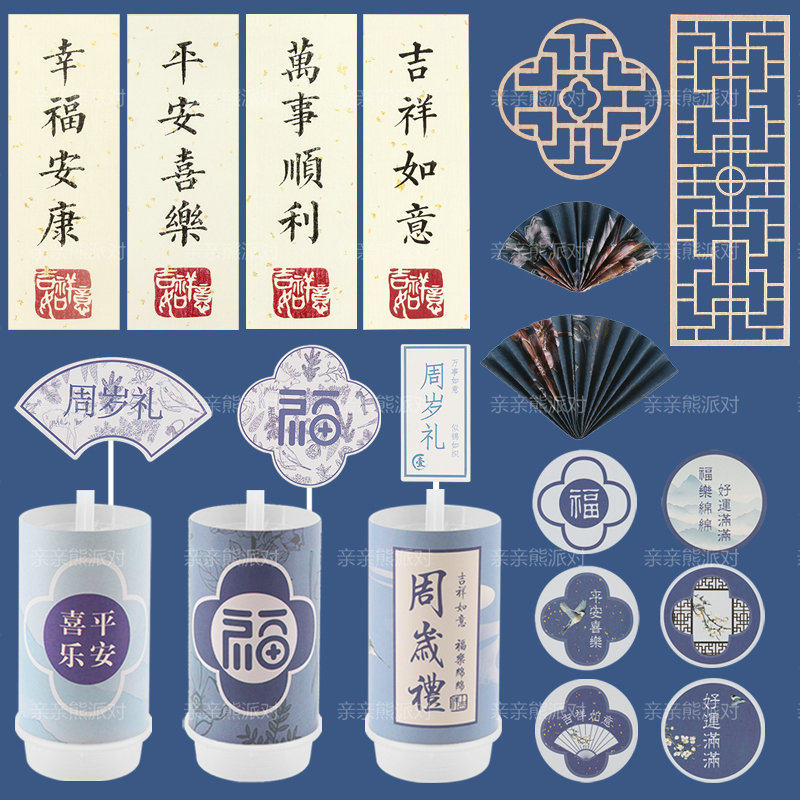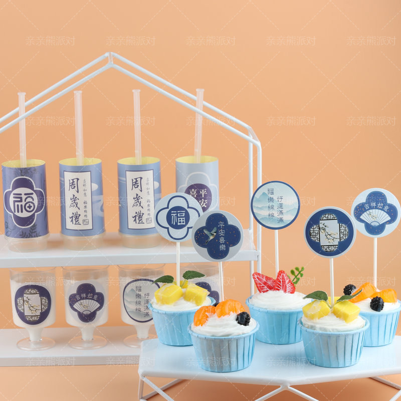 蓝色国风甜品台装饰儿童百日宴周岁新中式推推乐贴纸福字蛋糕插件