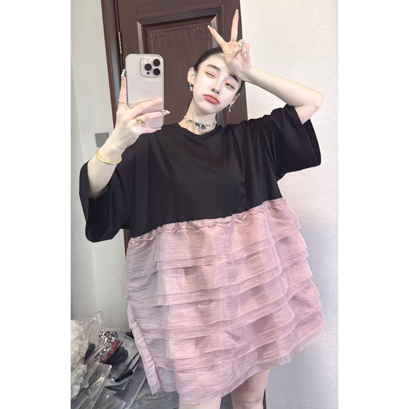 小众设计感2025秋新款女连衣裙宽松大码T恤拼网纱短裙时尚优雅潮