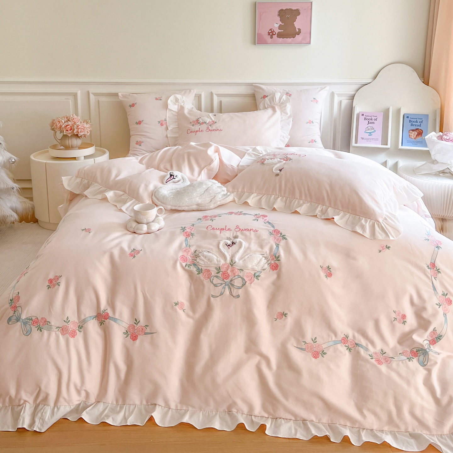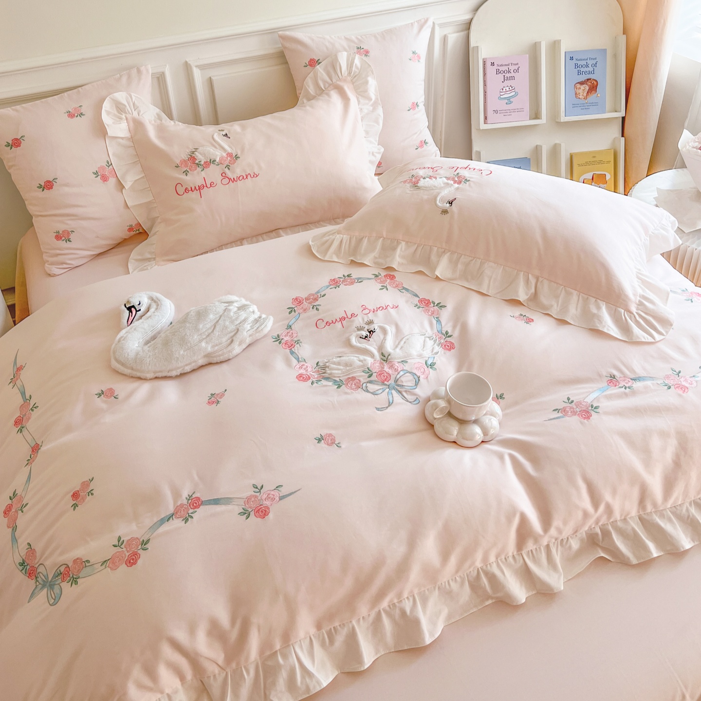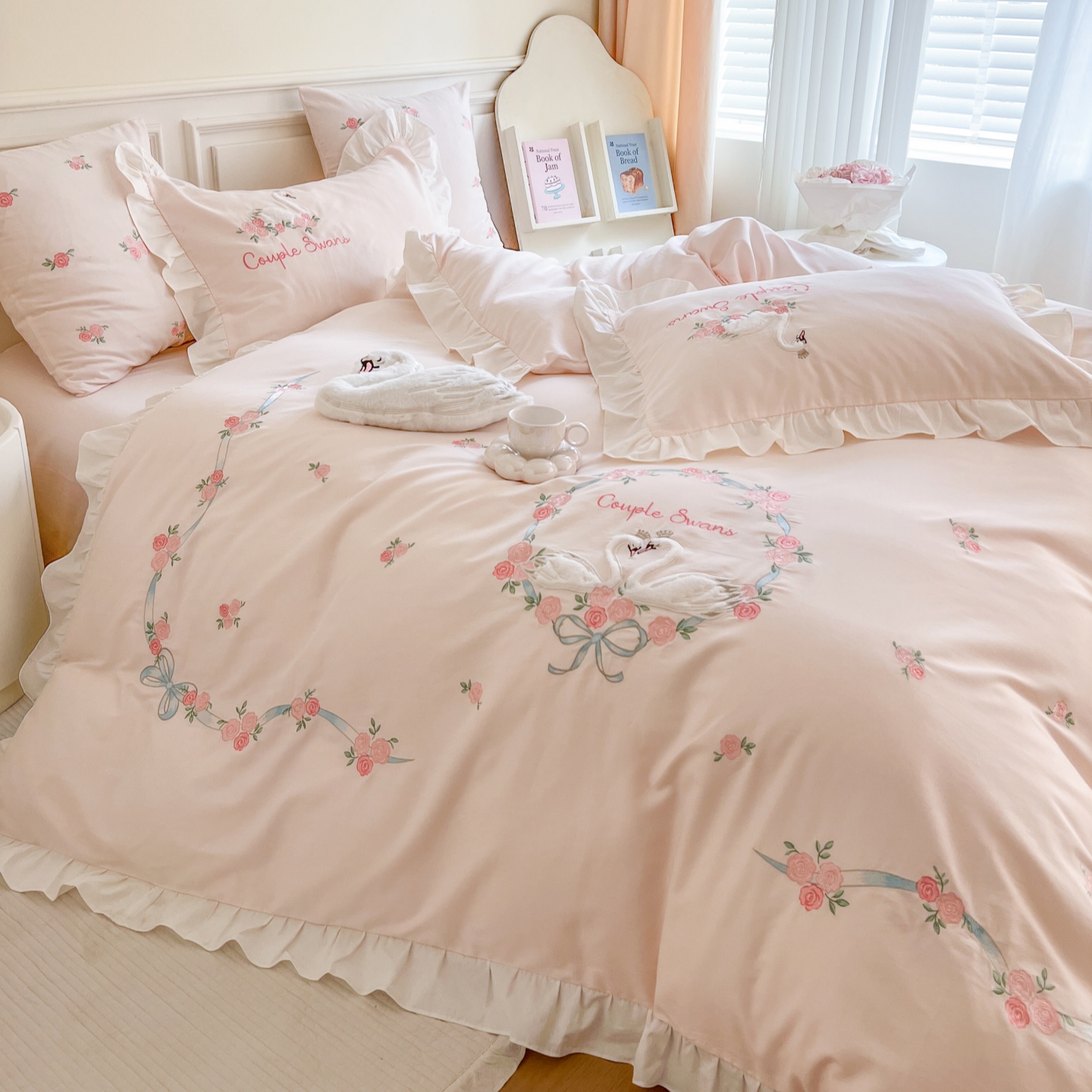 少女心纯棉加厚磨毛四件套全棉被套公主风天鹅儿童荷叶边床单床品