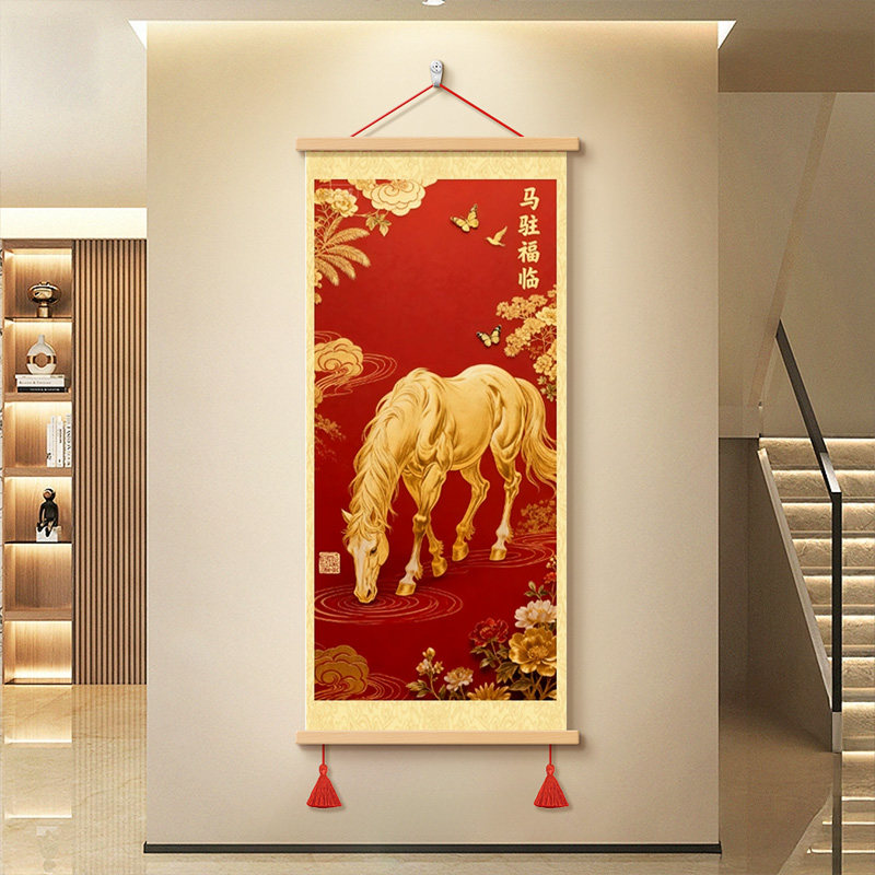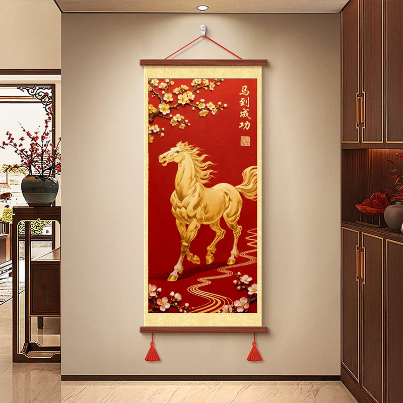 2026中式风马到成功装饰画客厅卧室挂画红色梅花金色骏马布卷轴画