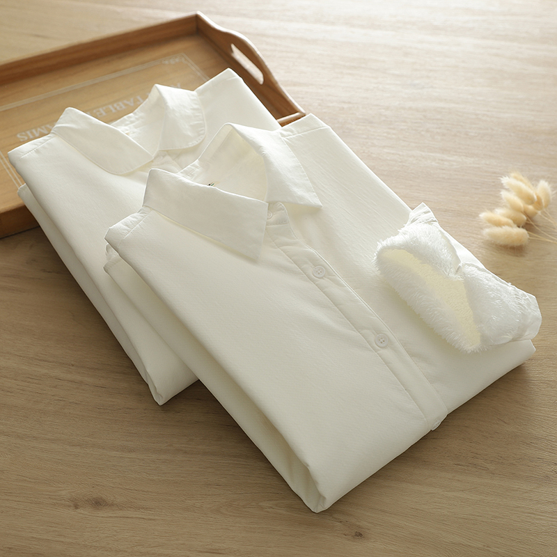 秋冬季纯棉加厚加绒白衬衫女长袖文艺职业日系保暖打底内搭衬衣