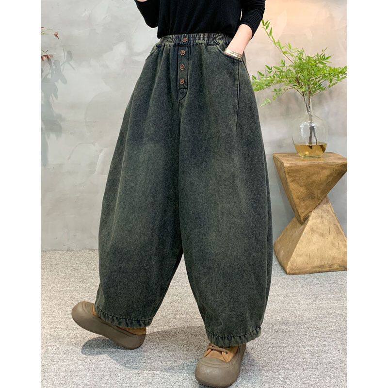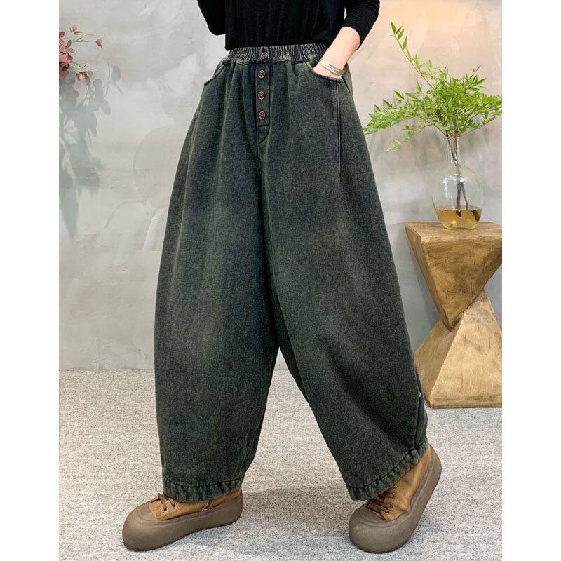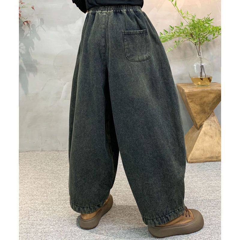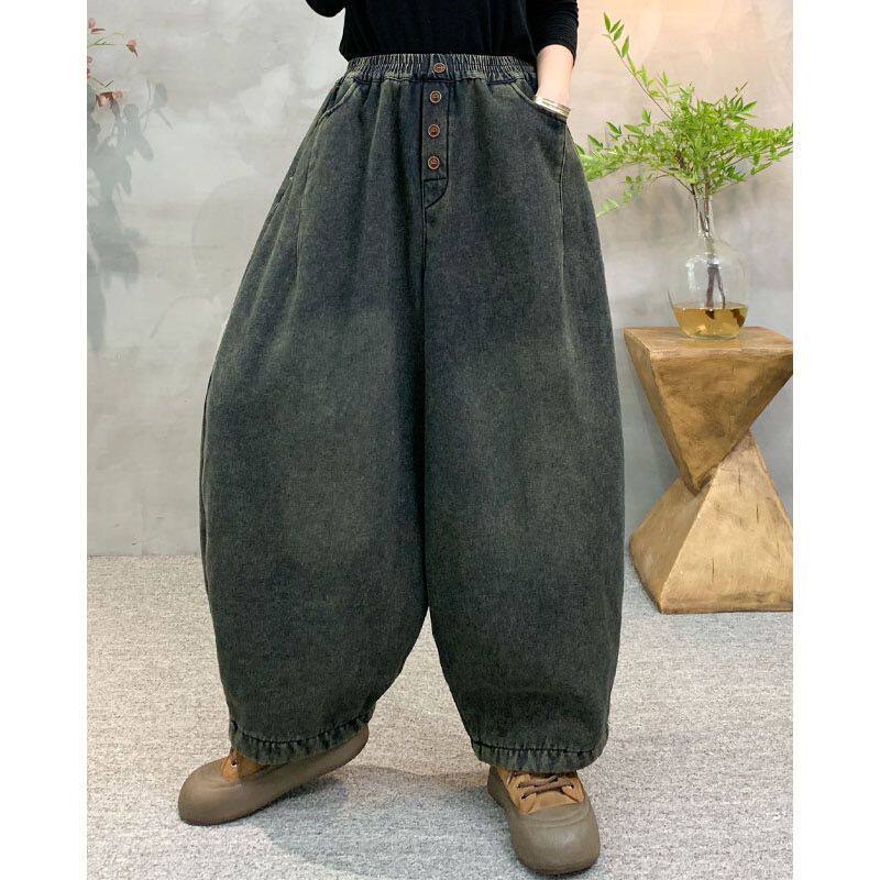 【加绒裤子】松紧腰深色水洗软牛仔哈伦裤复古宽松显瘦长裤冬加厚