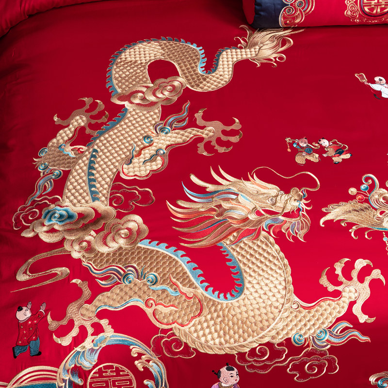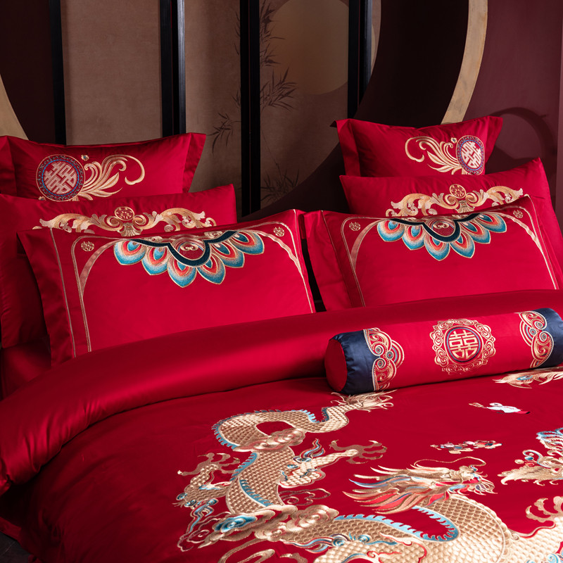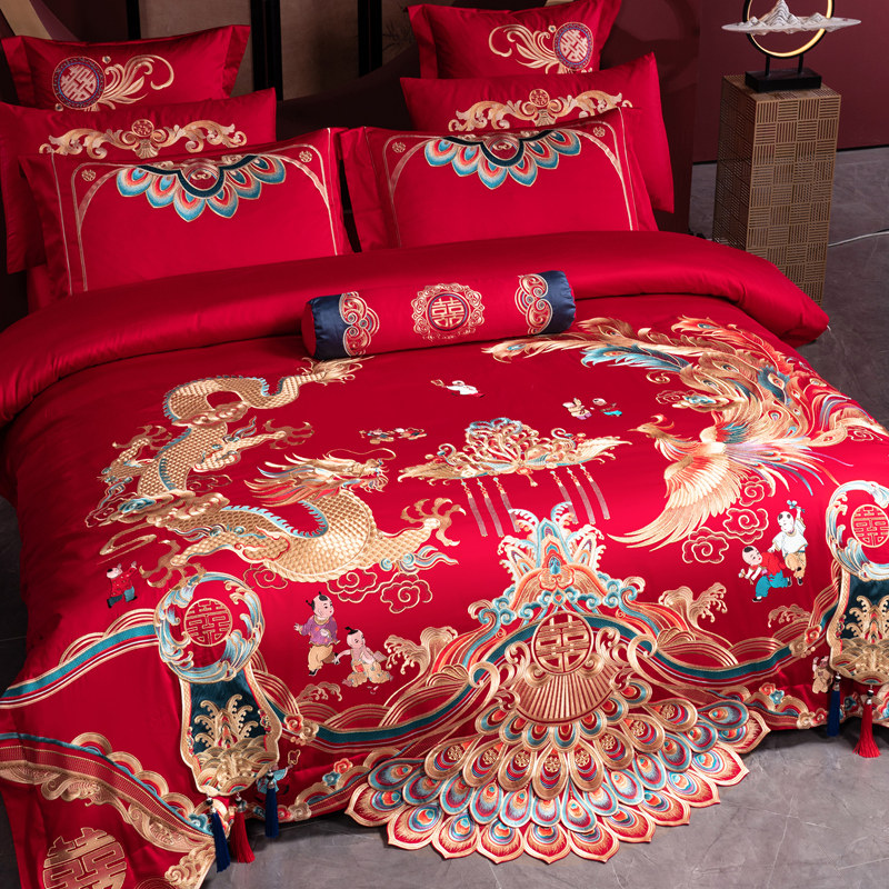 水星家纺婚庆四件套新款全棉高端刺绣多件套陪嫁龙凤大红被套床单