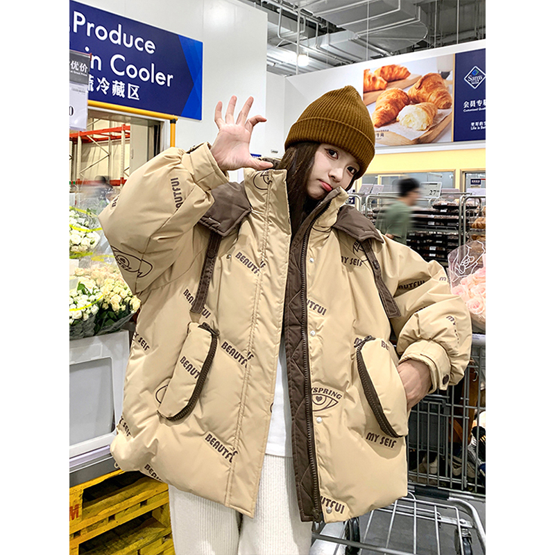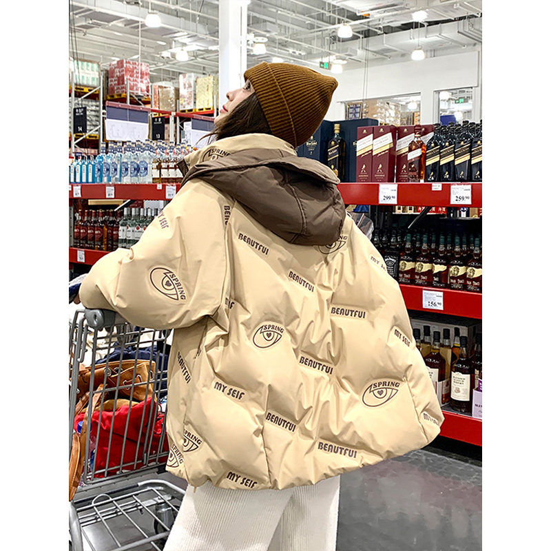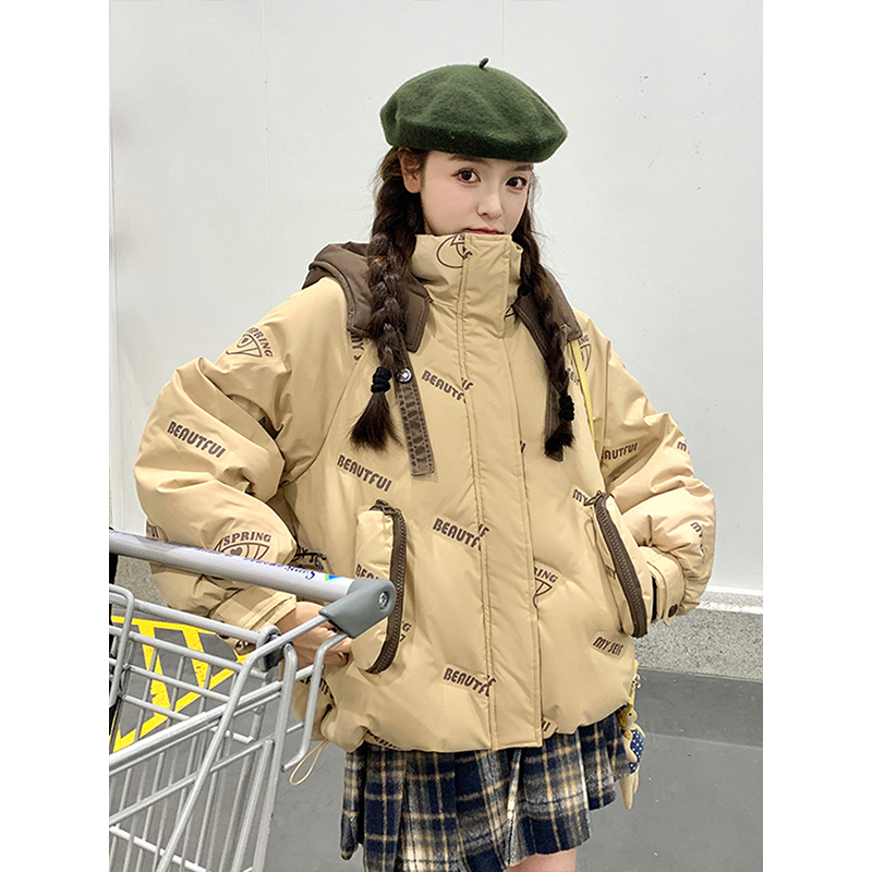 300斤大码女装卡其色印花羽绒棉服女胖mm短款冬季加厚面包服外套