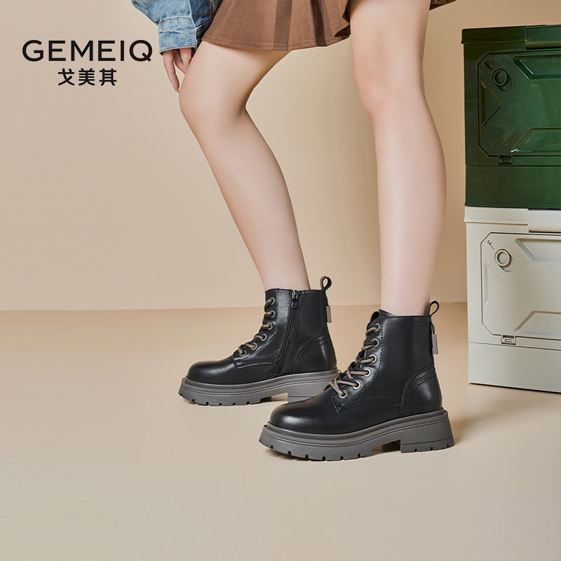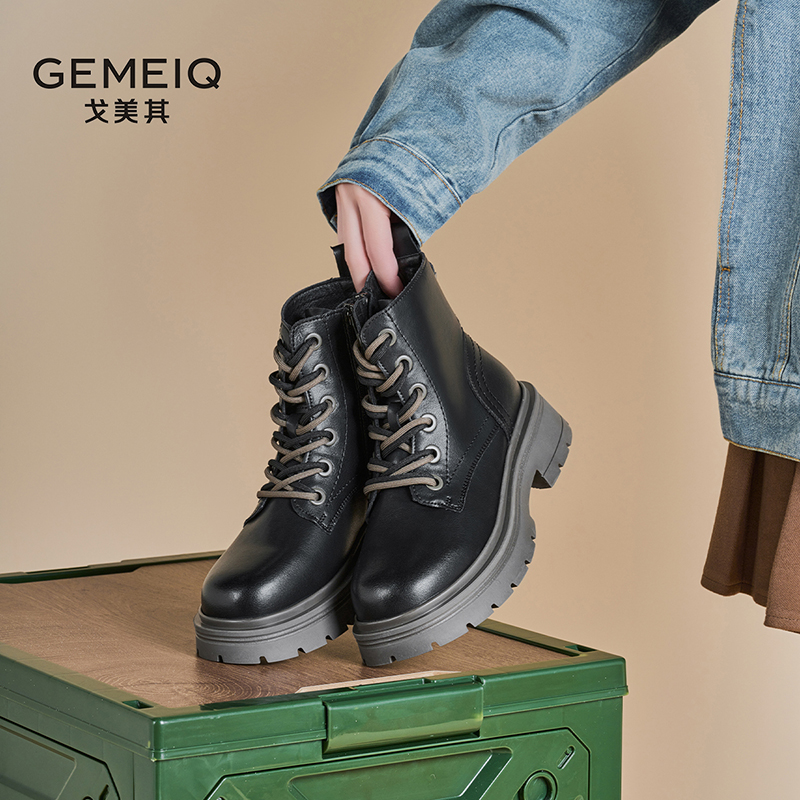 戈美其马丁短靴女2025春季新款厚底系带短筒英伦风加绒擦色大黄靴