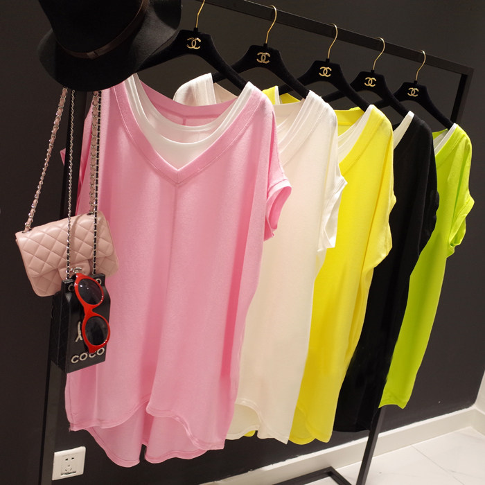 2025夏季新款V领短袖t恤女中长款纯色上衣夏两件套韩版宽松体恤裙