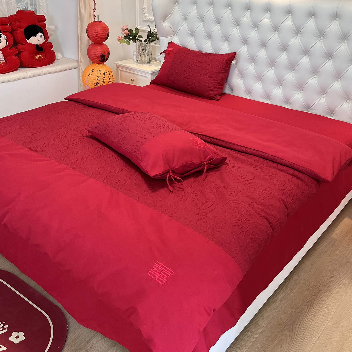 2025新款婚庆大红色绣花四件套喜庆玫瑰婚礼被套陪嫁床单床上用品