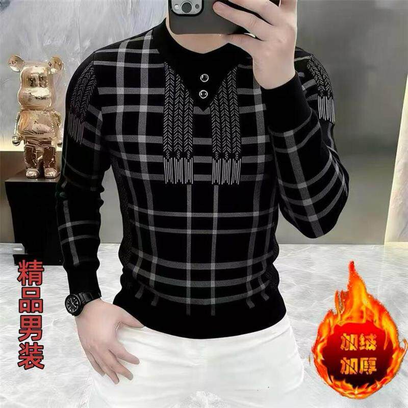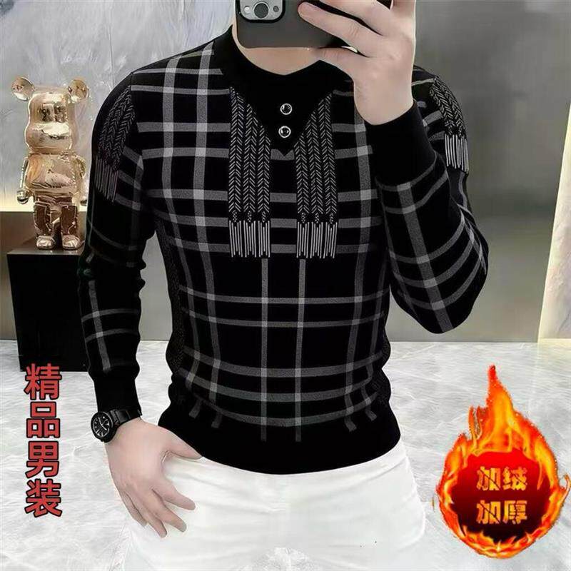 啓毅轻奢服饰欧洲站男卫衣围巾领加绒一体绒轻奢时尚格纹加厚保暖