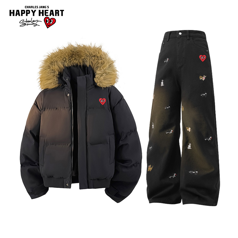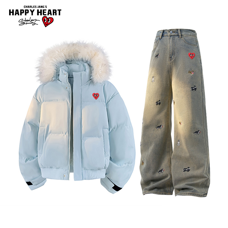 查尔斯桃心休闲套装男女冬季连帽保暖棉衣牛仔长裤子休闲两件装潮