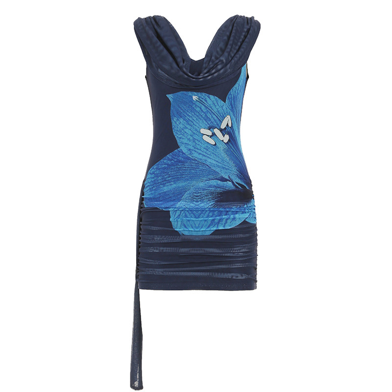 ROCKMORE【欧美辣妹】蓝色大花卉印花露肩无袖连衣裙收腰修身短裙