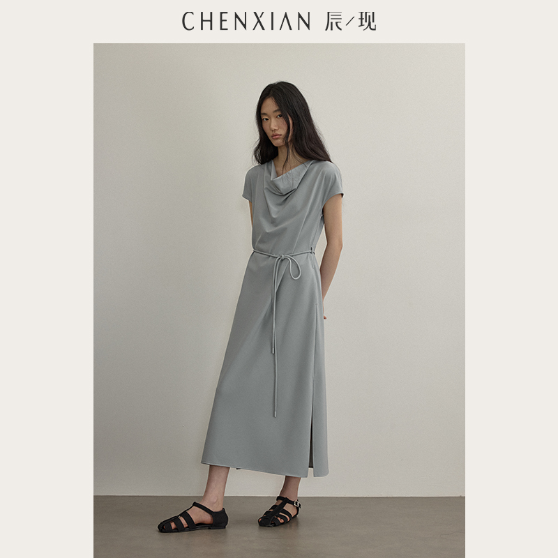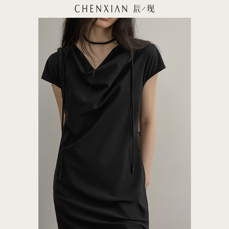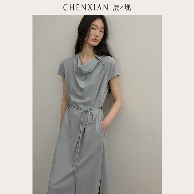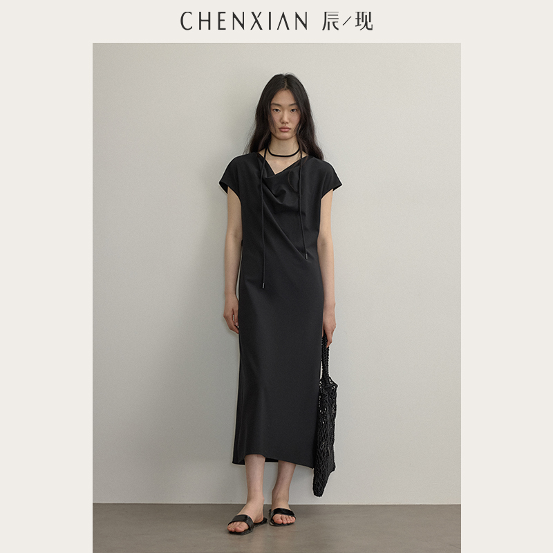 CHENXIAN辰现慵懒风醋酸羊毛小飞短袖荡领连衣裙A字中长款裙子女