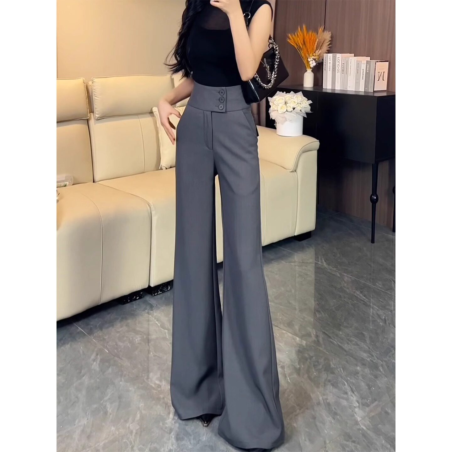 灰色排扣高腰微喇西装裤女2026春夏新款气质垂感不贴腿喇叭长裤女