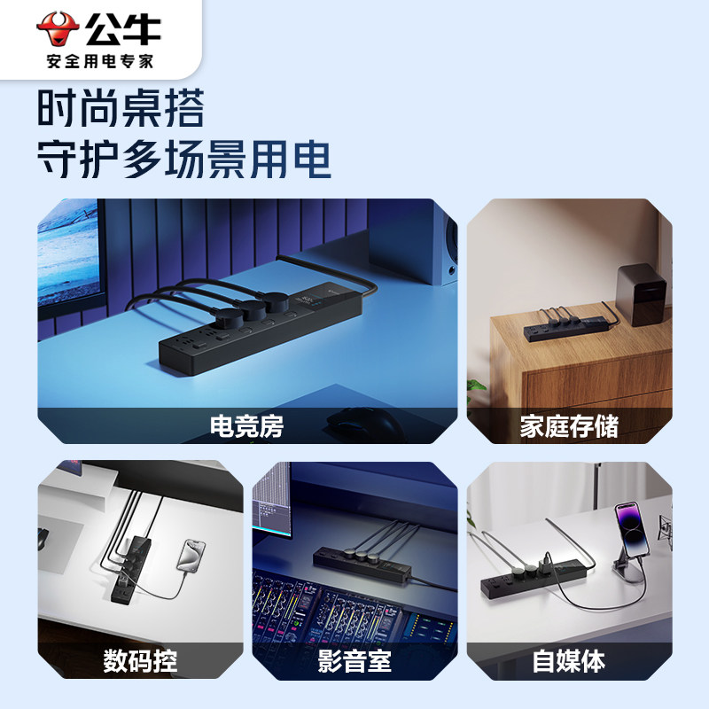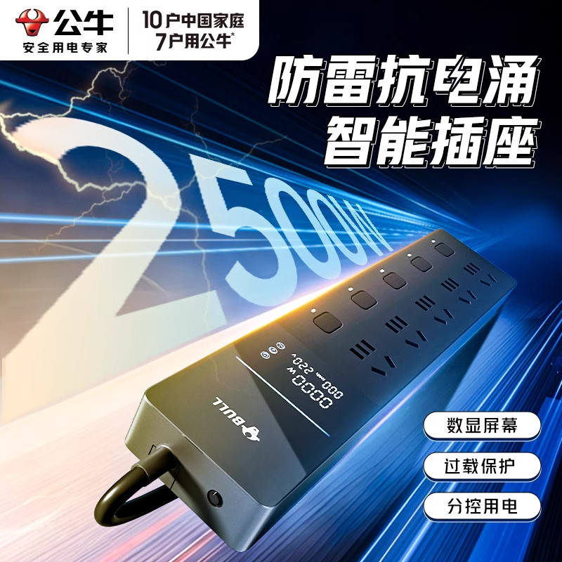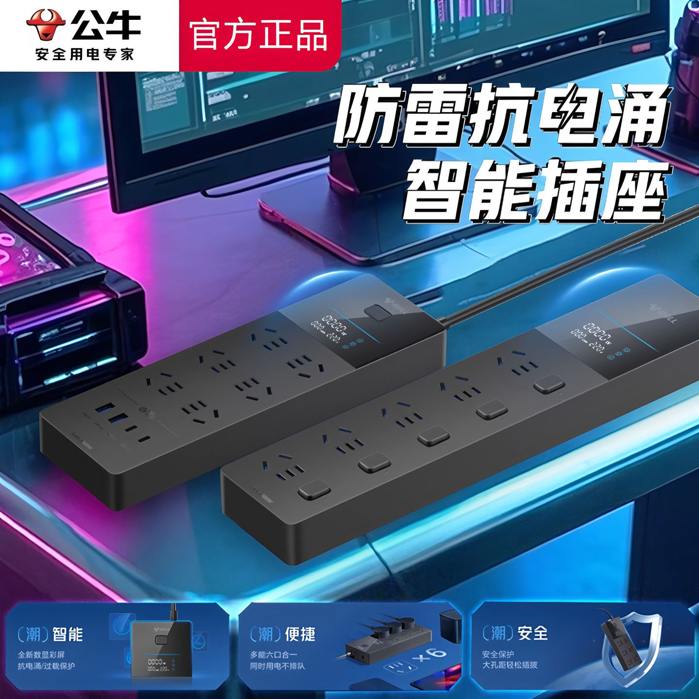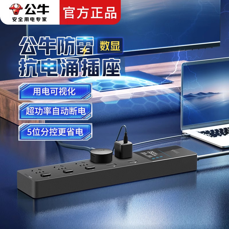 公牛新数显防雷抗电涌多孔家用插座过载保护插排多功能线板接线板