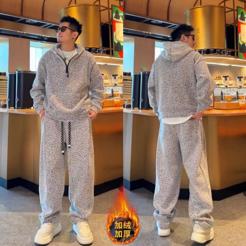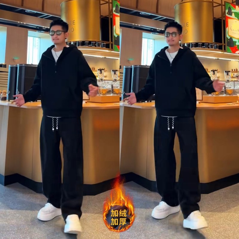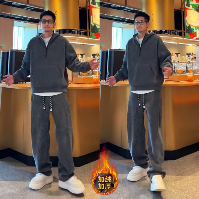 冬季加绒半拉链连帽卫衣长裤套装