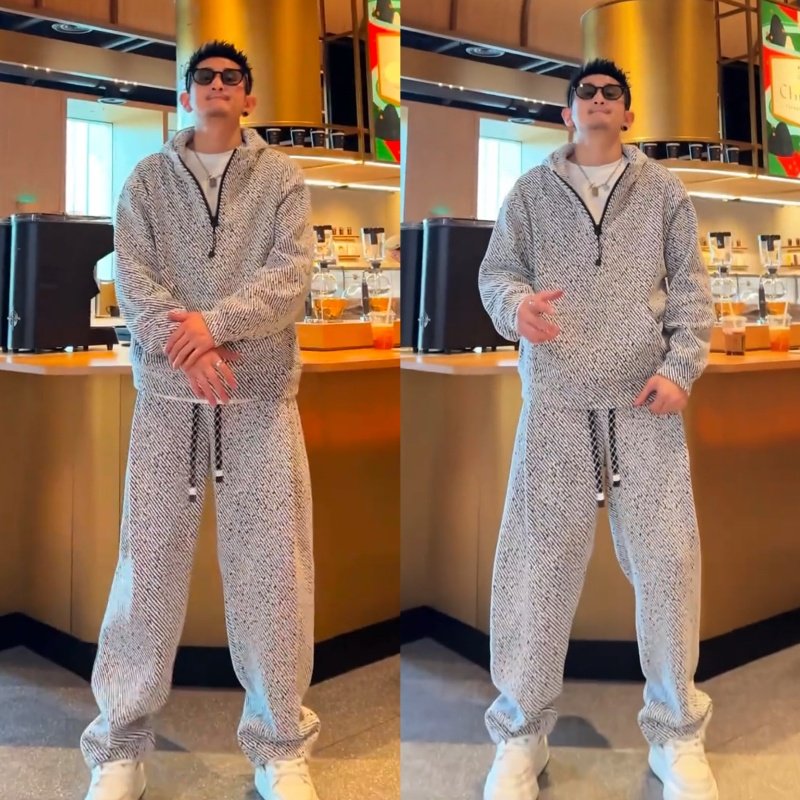 时尚宽松个性斜条纹设计休闲套装男潮流半拉链连帽加绒卫衣直筒裤