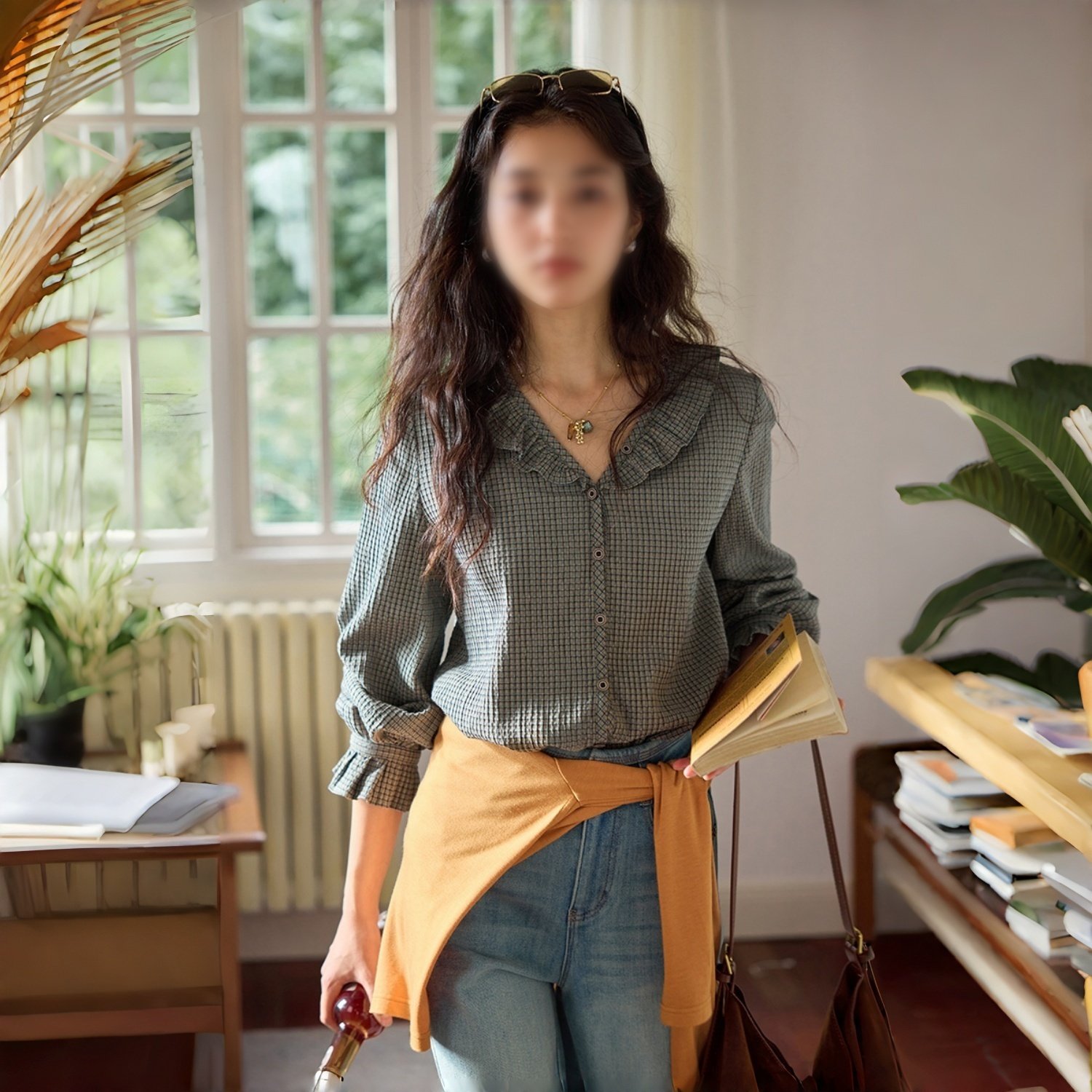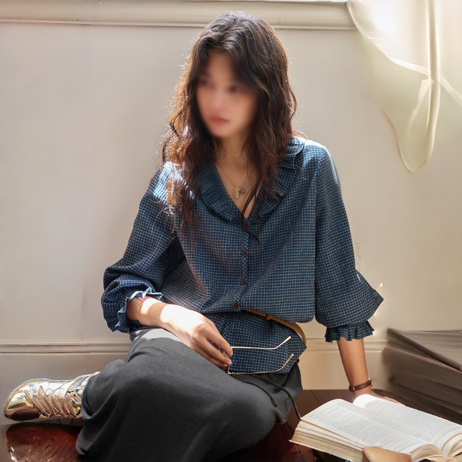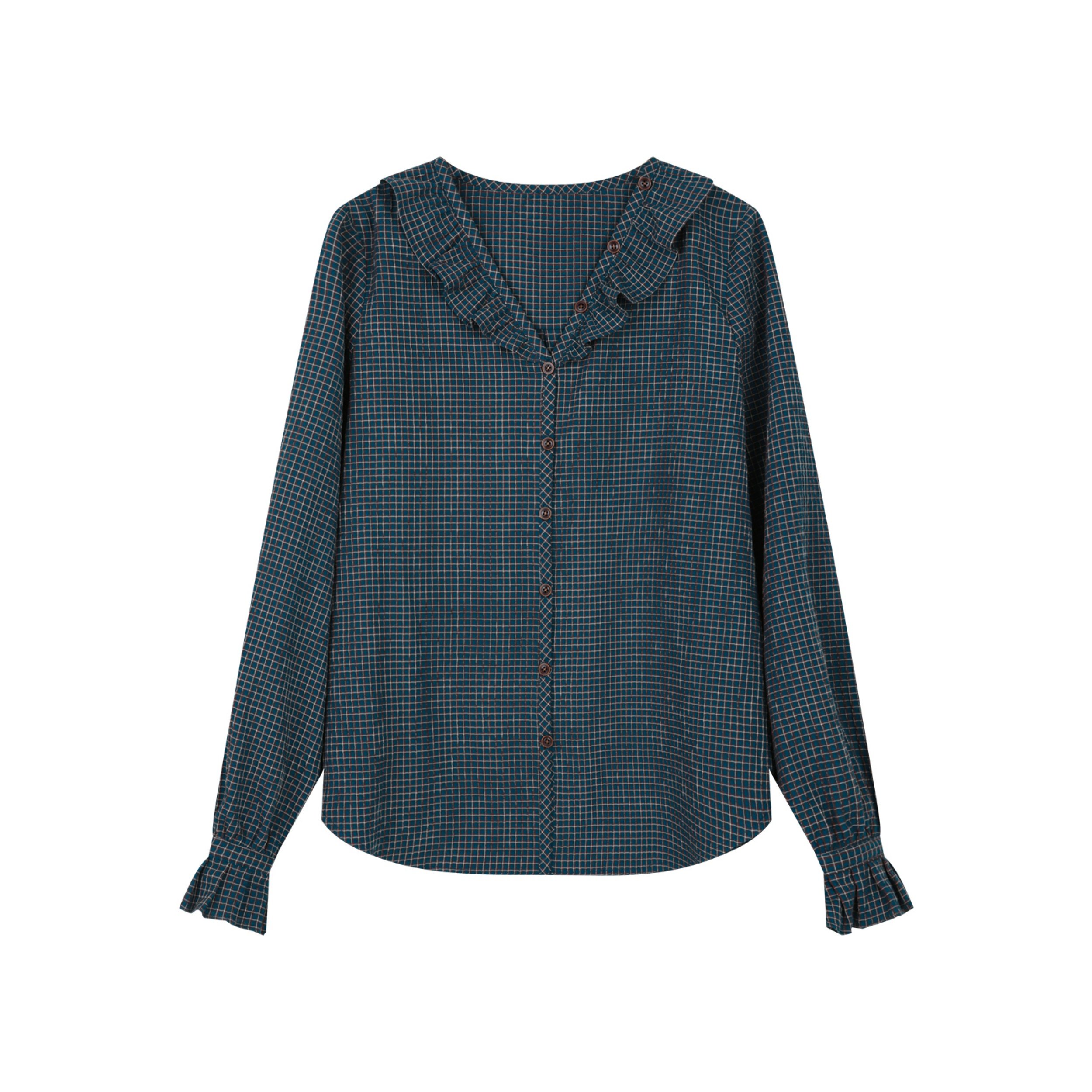 素衣彼时3655春秋简约女衬衣纸样法式复古V领荷叶边格子衬衫样板