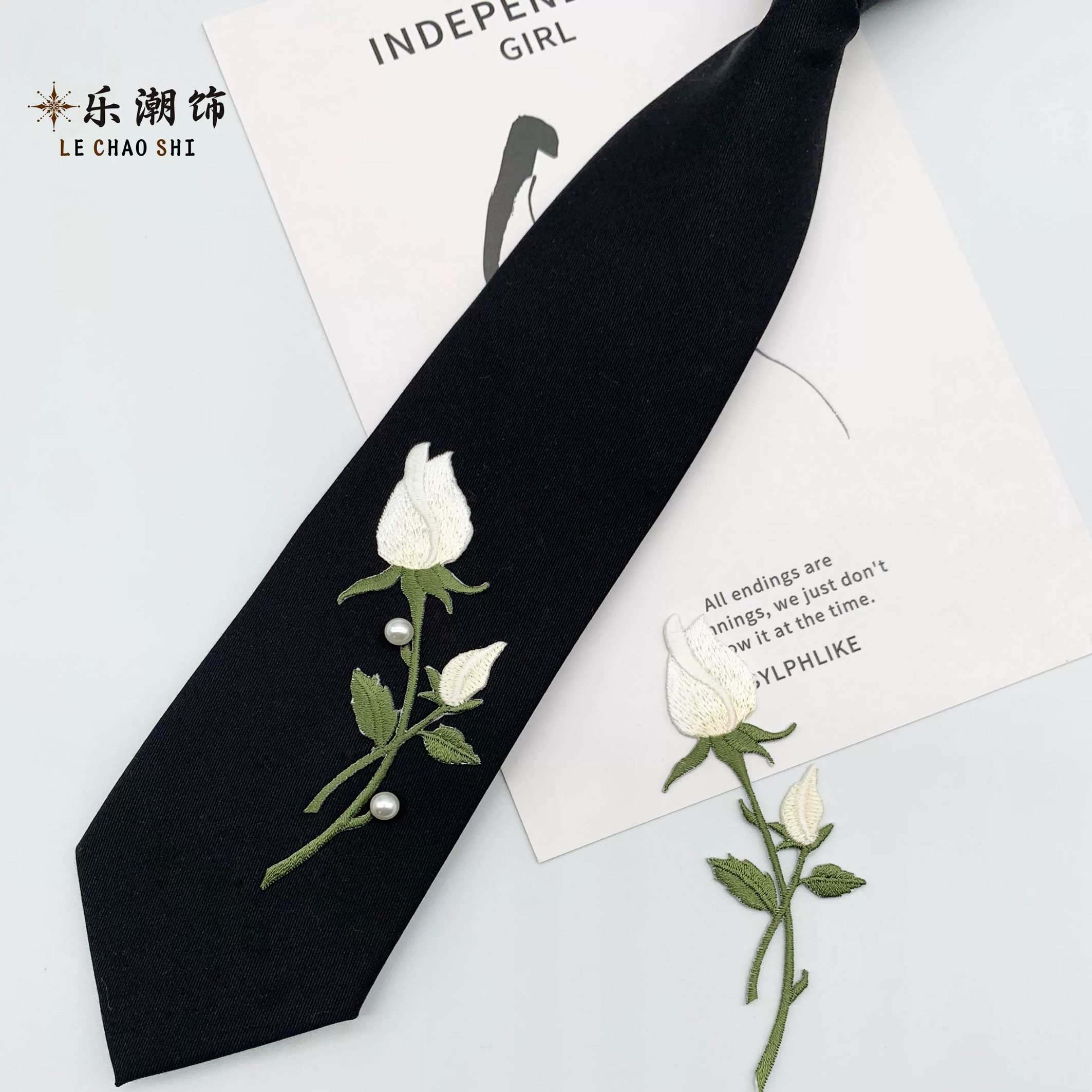PAPR饰原创新中式白色玫瑰花刺绣领带女文艺复古免打衬衫学院风饰