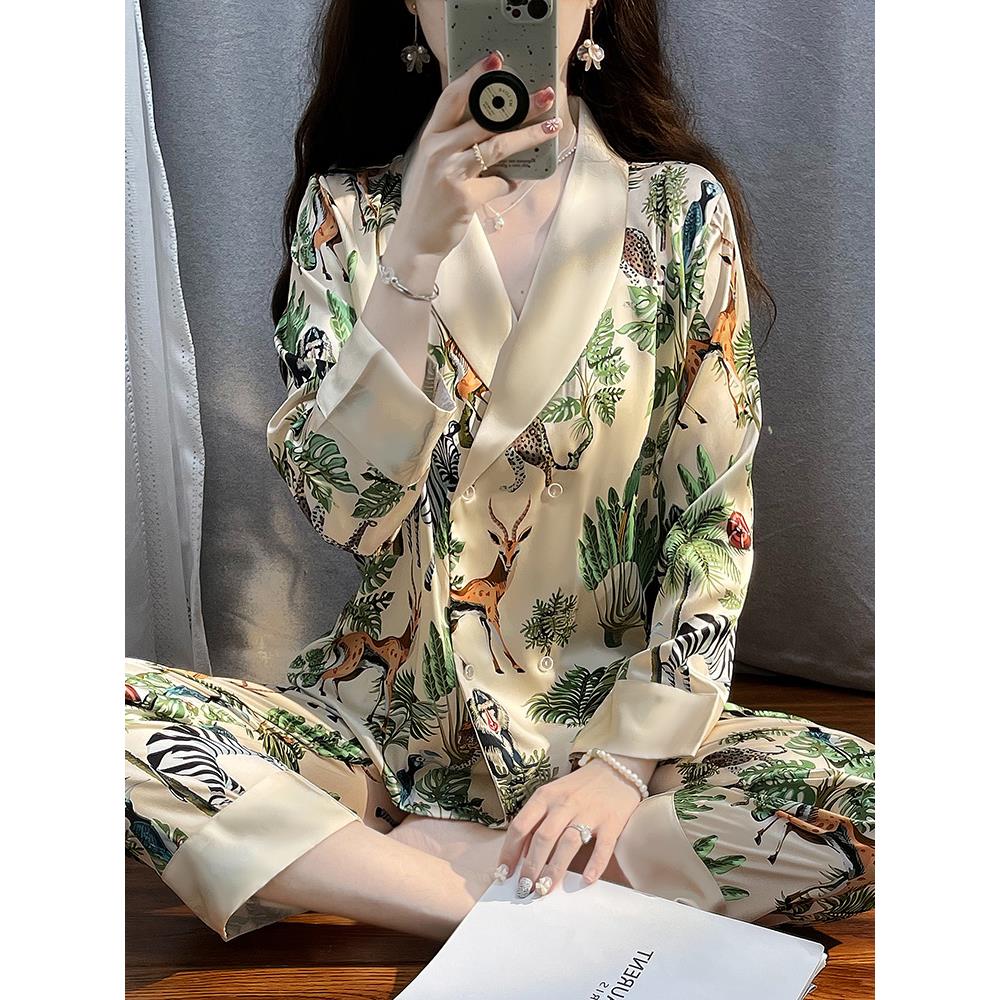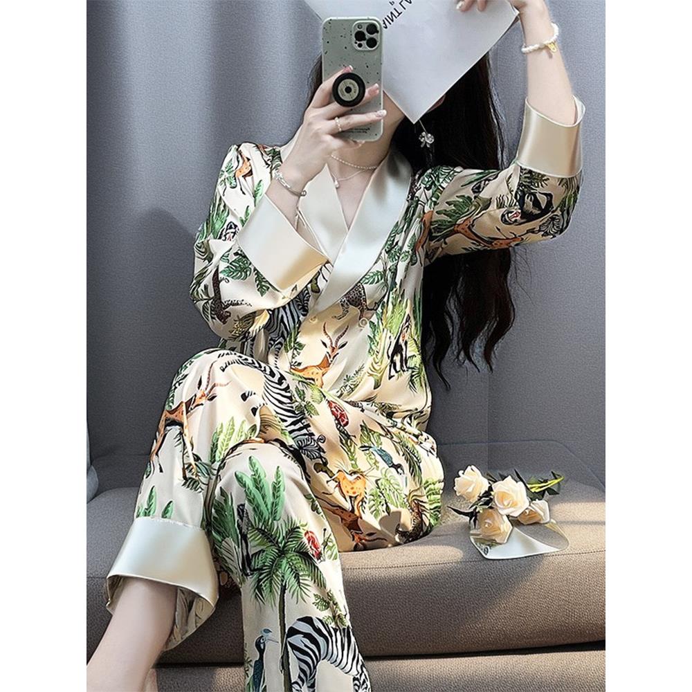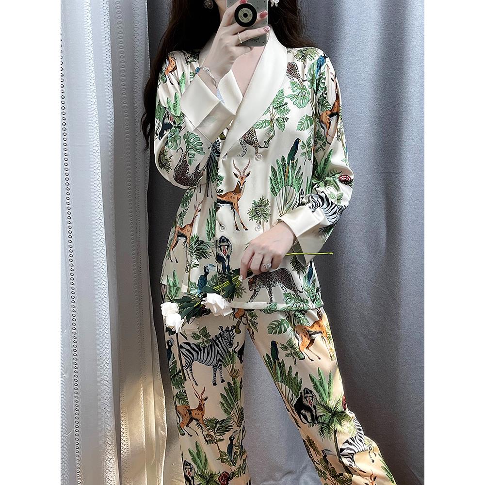 维多利亚轻奢睡衣桑蚕丝女士长袖春秋夏季真丝套装家居服印花动物