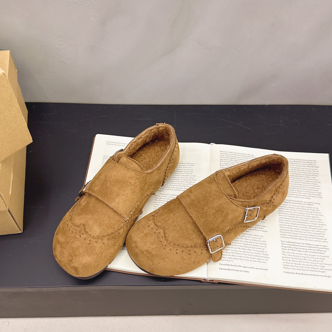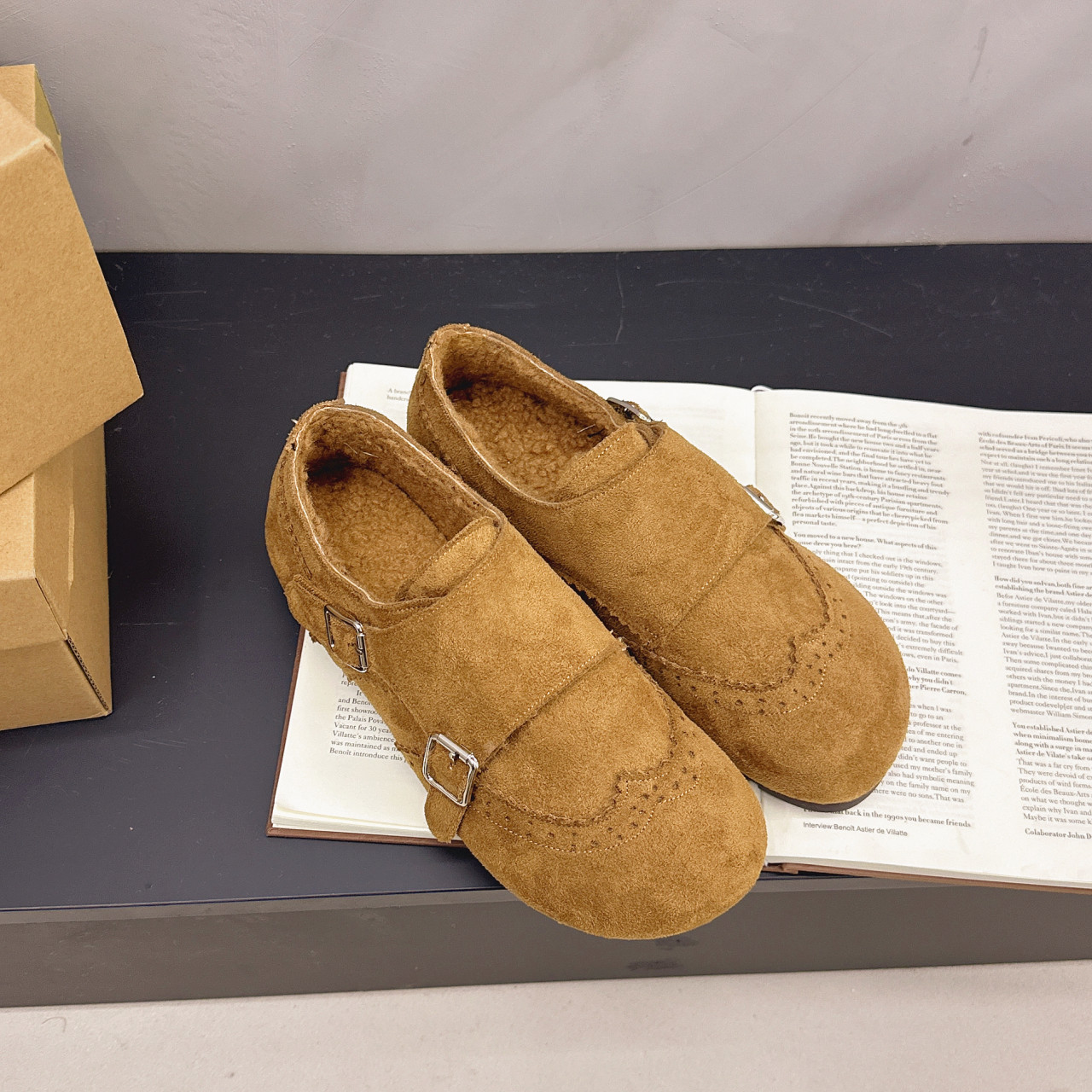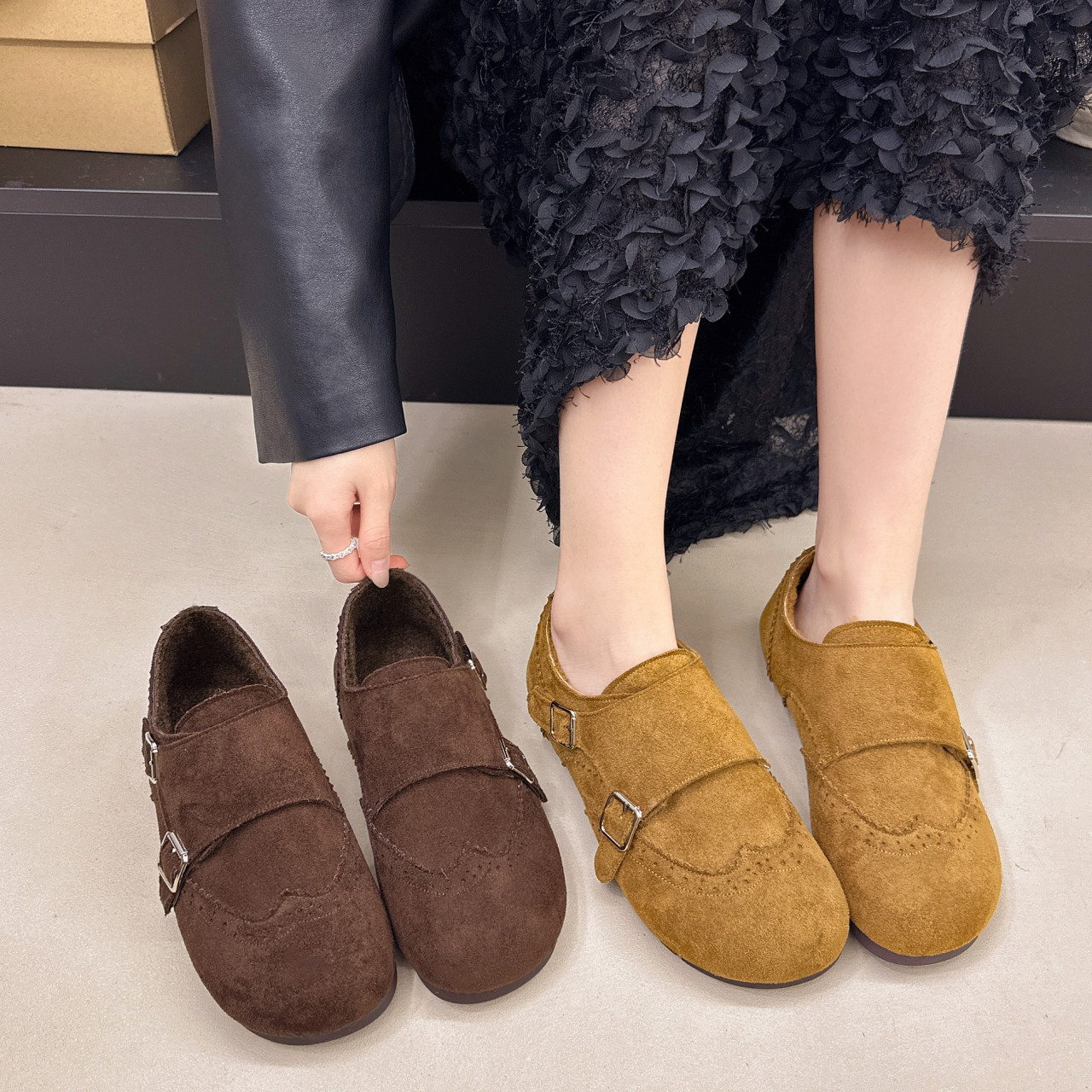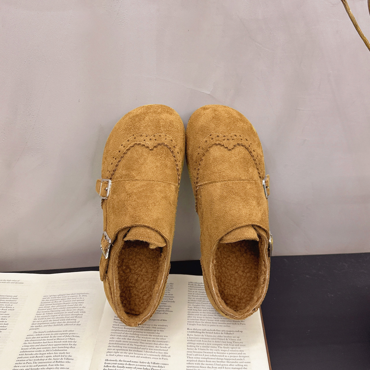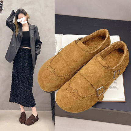 牛皮版~英伦风反绒乐福鞋女皮带扣勃肯鞋平底外穿加绒豆豆单鞋女