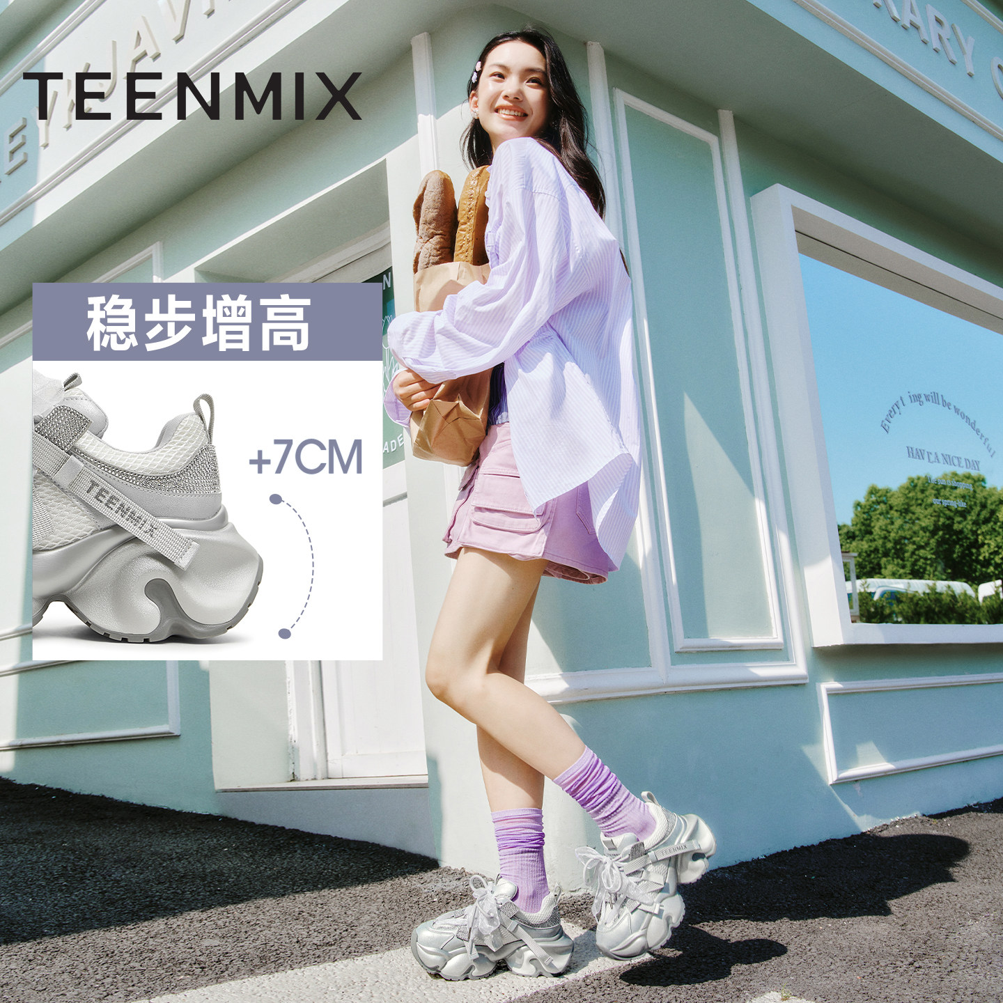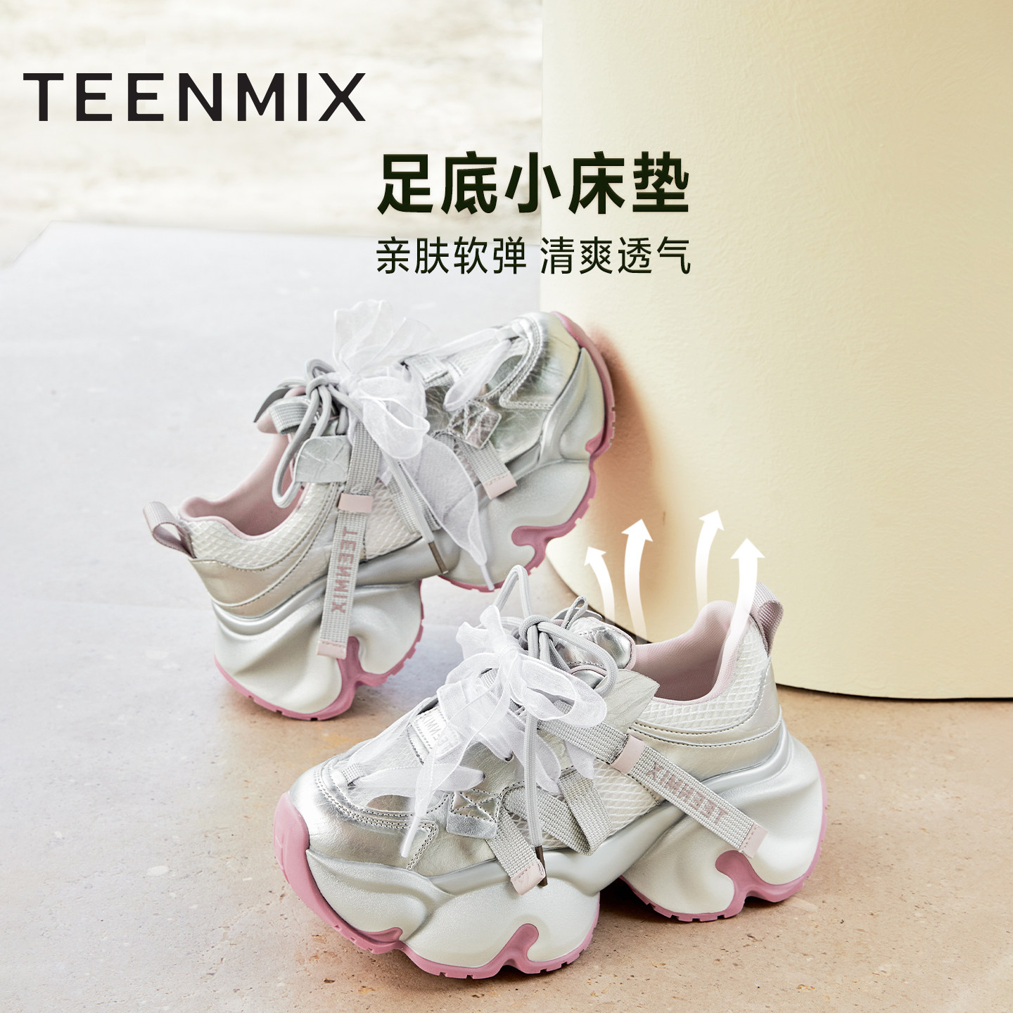 天美意网面透气厚底增高老爹鞋银色运动鞋女小白休闲鞋2025秋新款