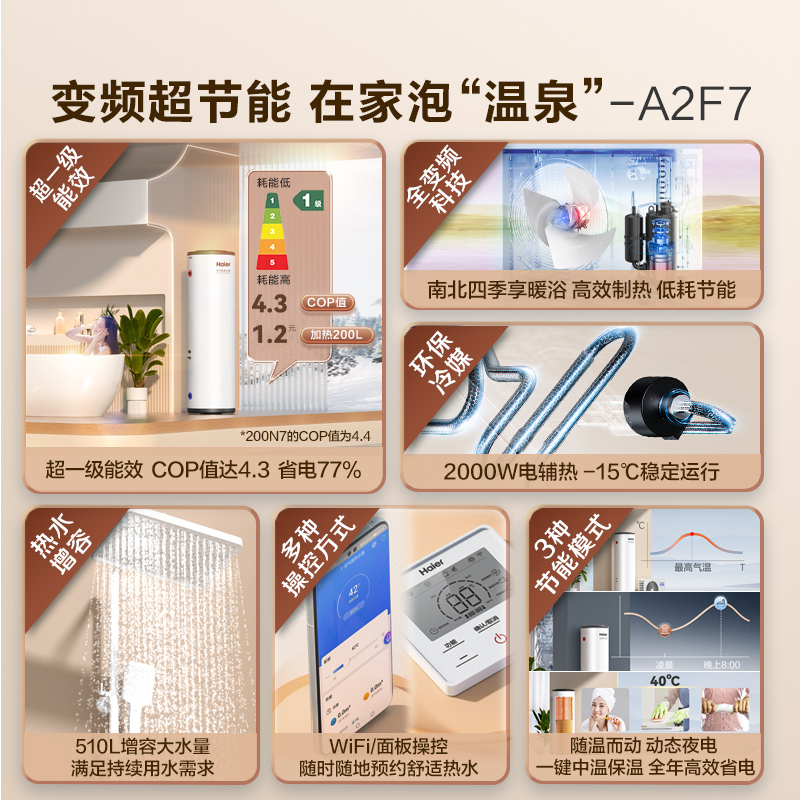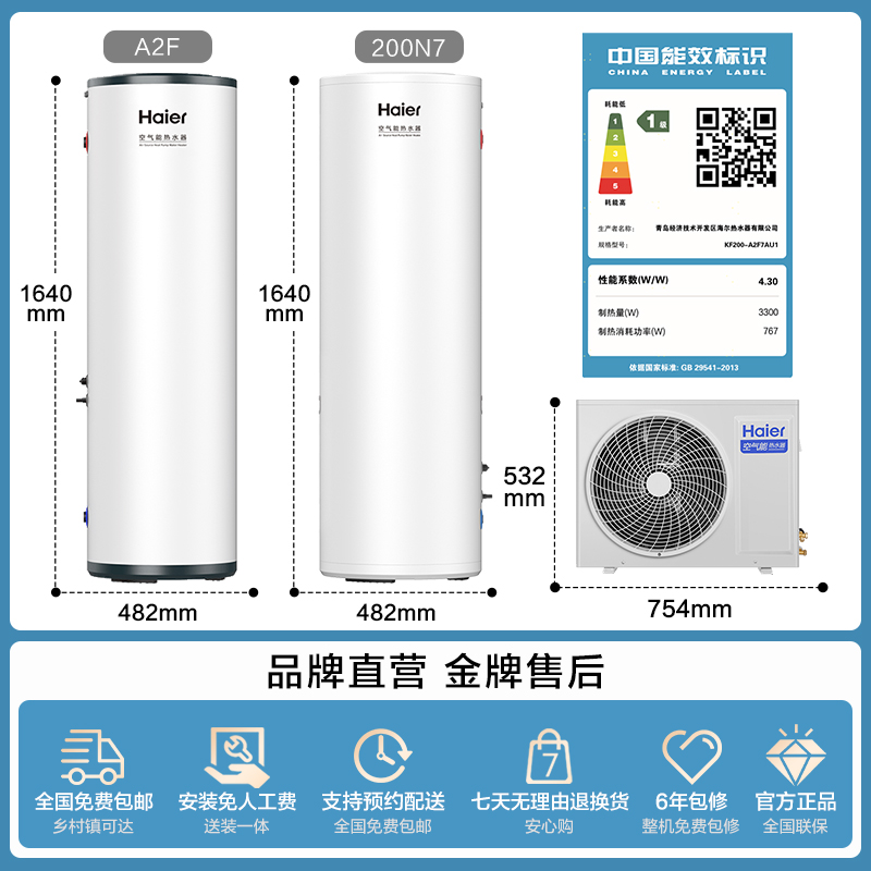 海尔空气能热水器200L家用超一级能效全变频N7大1匹空气源热泵A2F