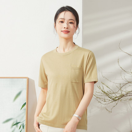 春竹纯色拼贴口袋显瘦圆领短袖上衣夏季新款2025基本款百搭女T恤