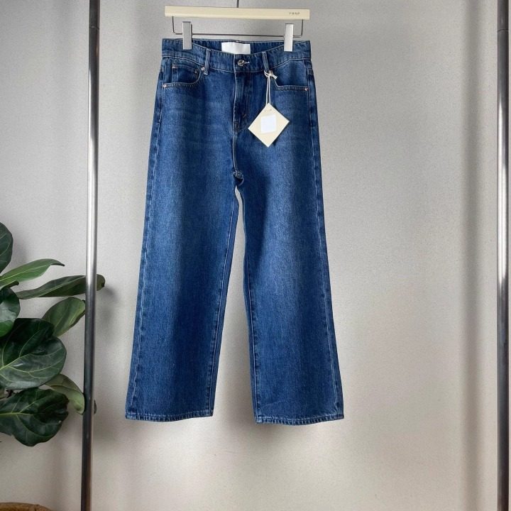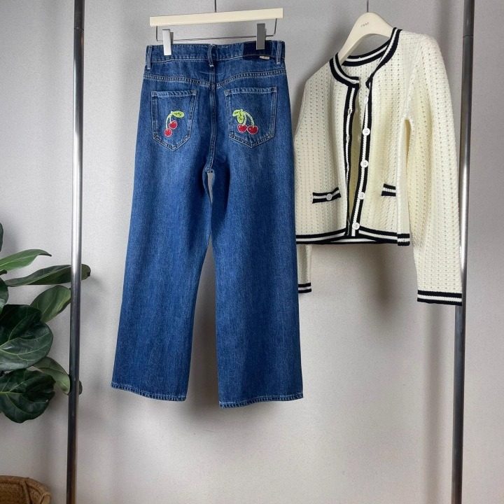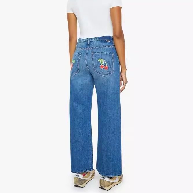 mo25早秋显瘦欧美高腰樱桃图宝蓝色阔腿直筒及踝九分牛仔裤小个子
