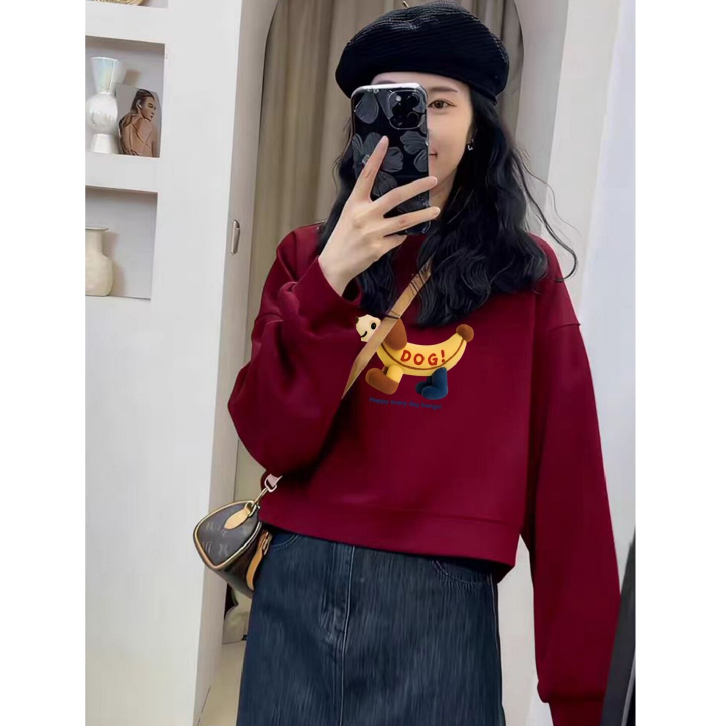本命年酒红色短款卫衣女秋冬季保暖加绒加厚宽松圆领上衣狗狗印花