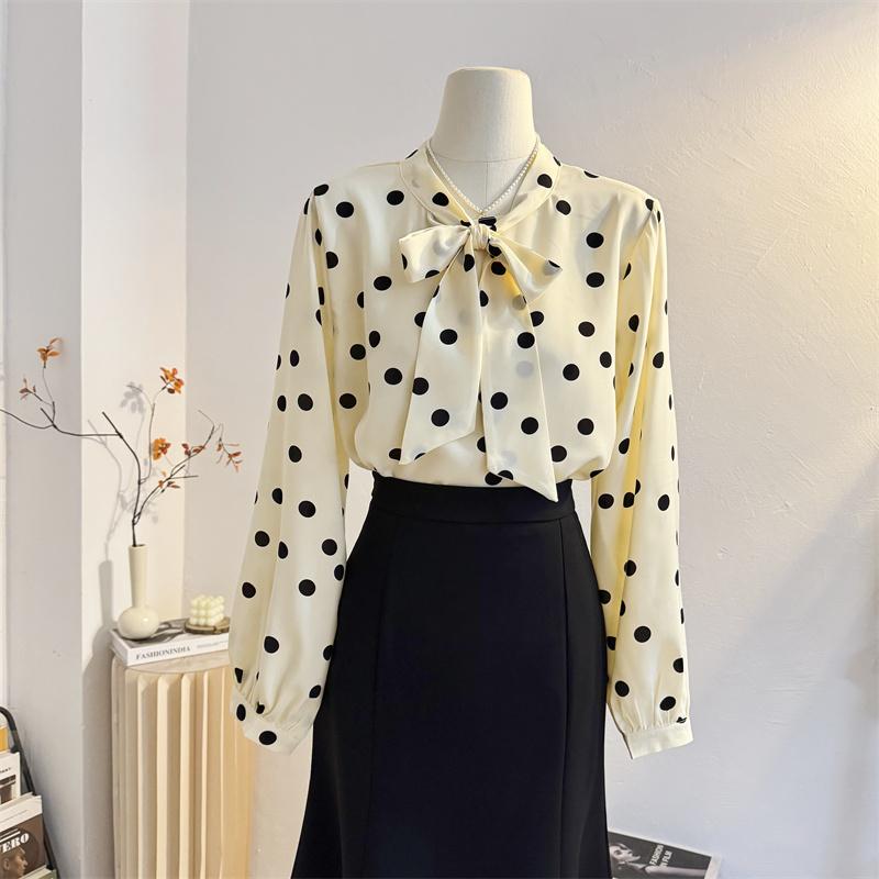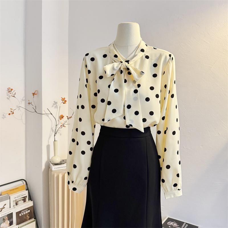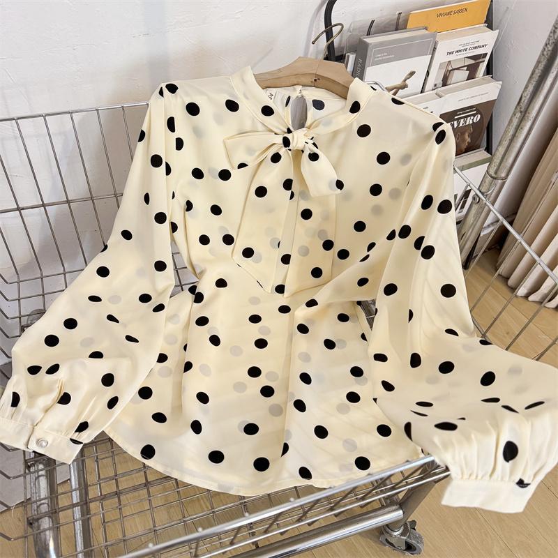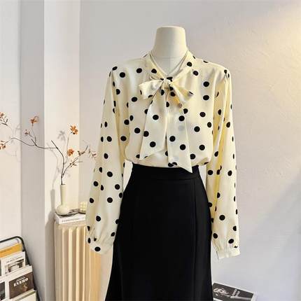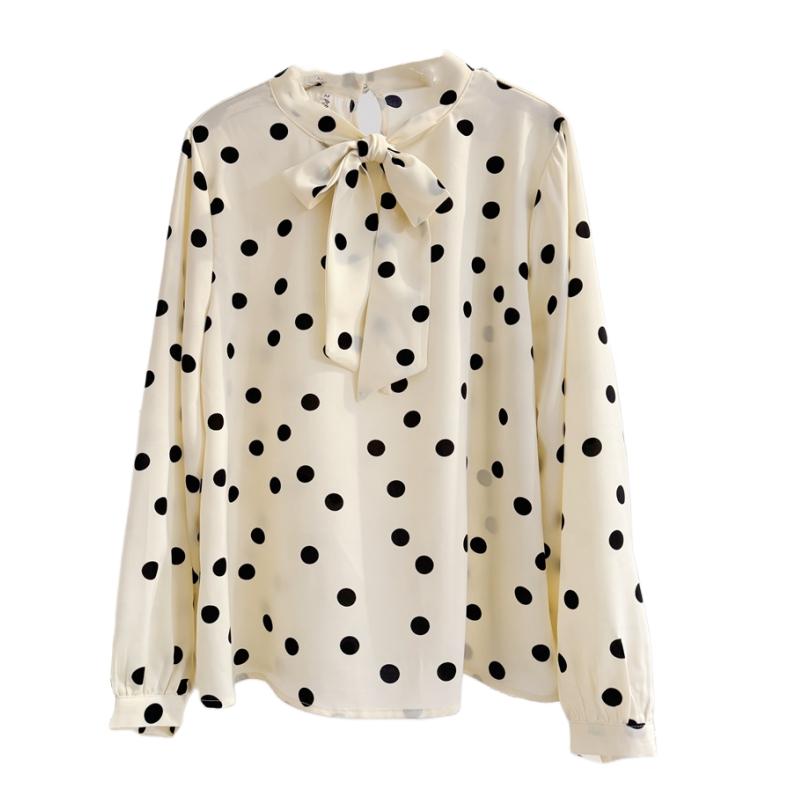 法式温柔蝴蝶结波点雪纺长袖衬衫