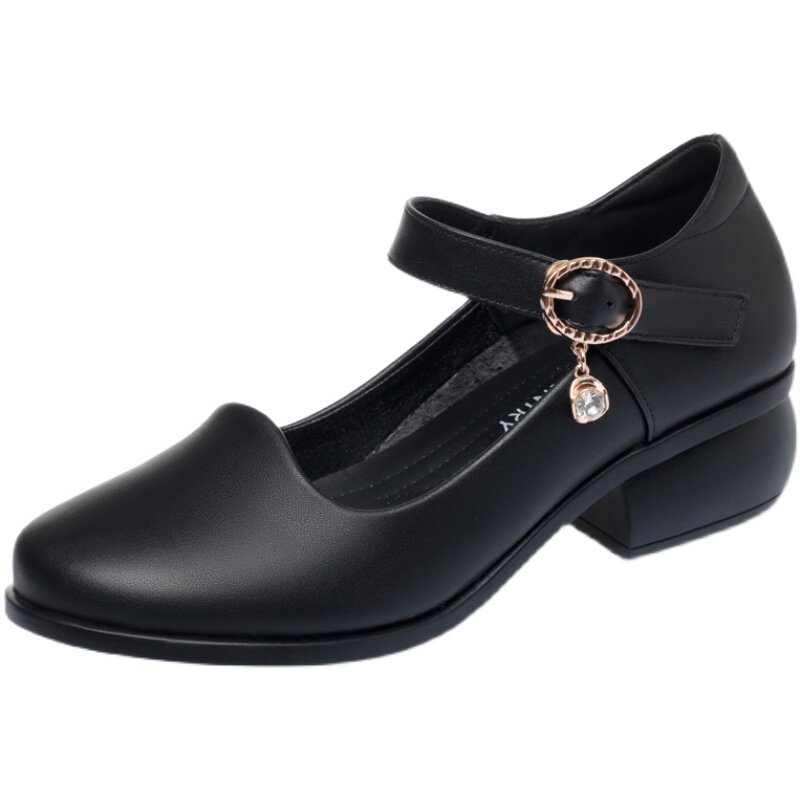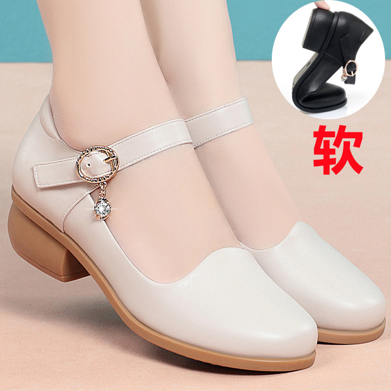 真皮妈妈鞋单鞋配旗袍跳舞中跟软底中老年鞋女士皮鞋圆头粗跟浅口