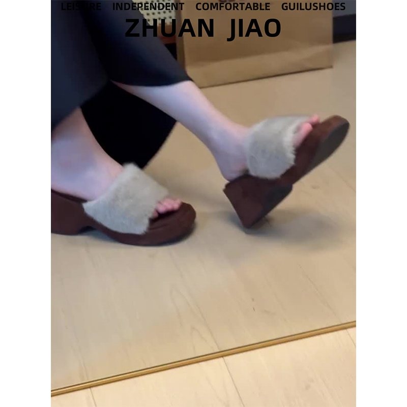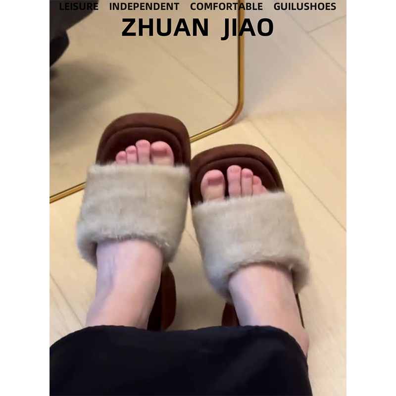 羊皮版~复古方头毛毛拖鞋女防水台一字带时尚气质懒人厚底高跟鞋