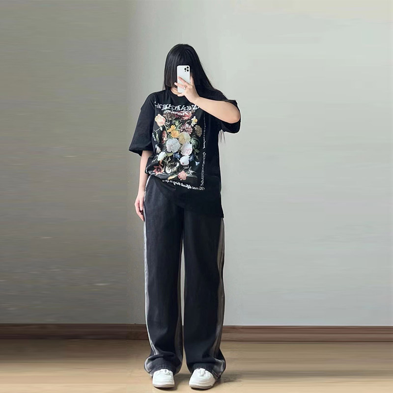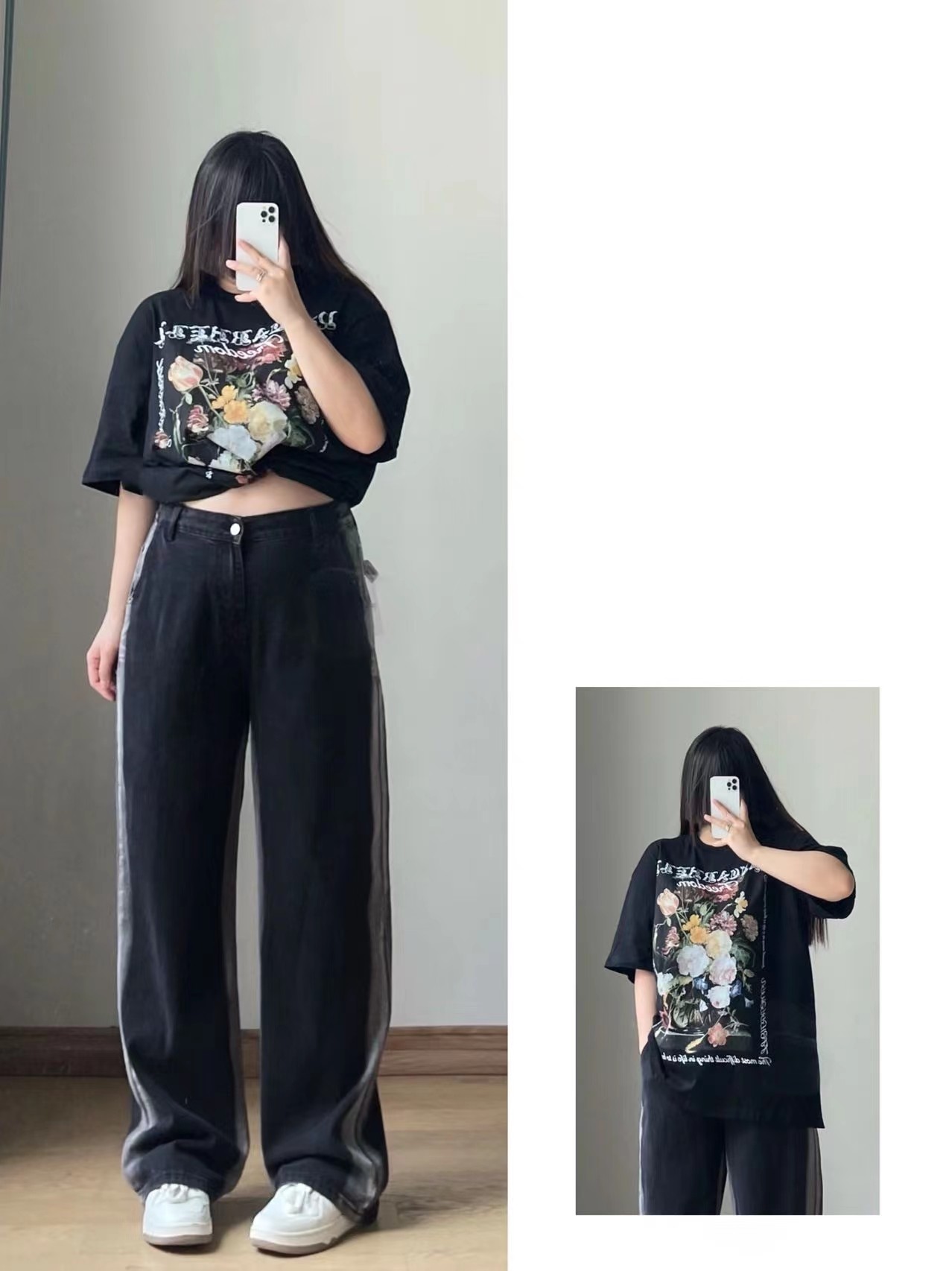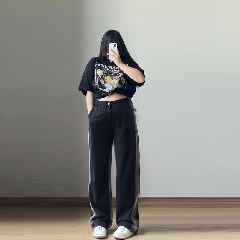 300斤特大码女装牛仔裤女胖mm黑色夏季新款宽松高腰渐变色阔腿裤