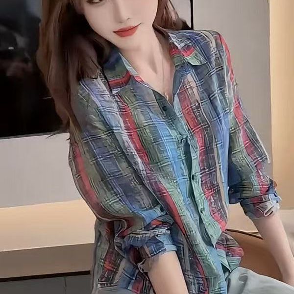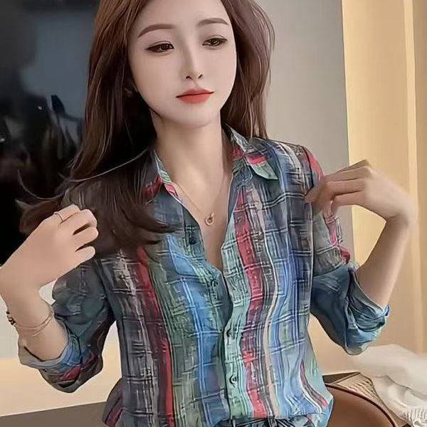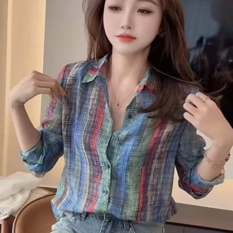 2025夏季宽松显瘦百搭减龄小众上衣港风复古撞色条纹长袖衬衫女装