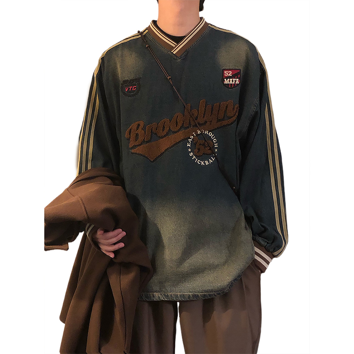 NAGAWL秋季美式复古宽松休闲植绒字母拼接V领牛仔长袖T恤套头卫衣