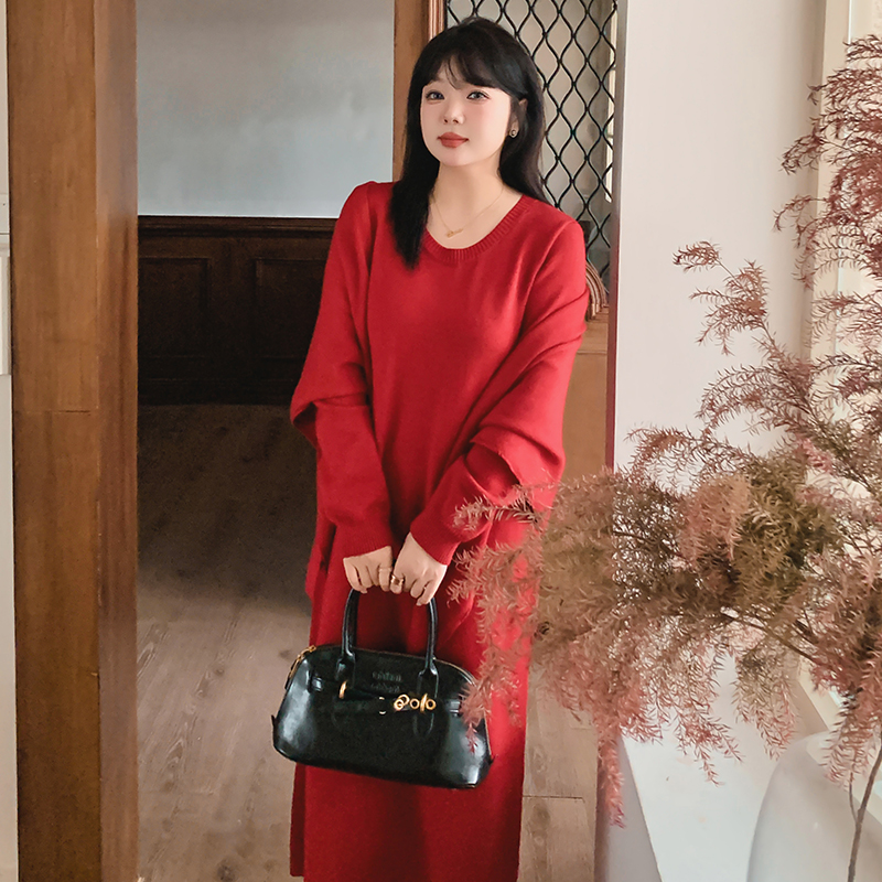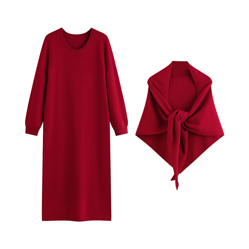 【清仓】圆领内搭针织裙女直筒长裙2024冬胖mm百搭连衣裙披肩套装