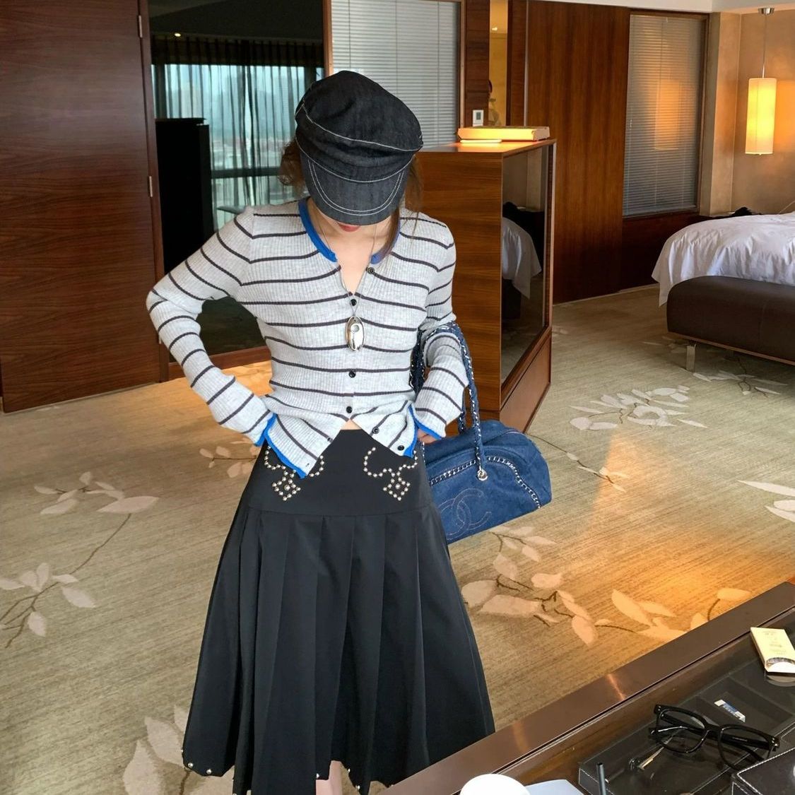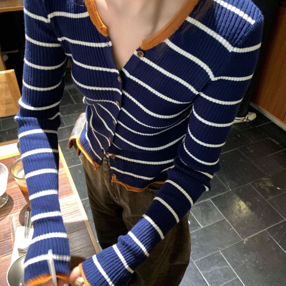 韩系撞色条纹针织开衫女春秋季修身短款纽扣毛衣百搭显瘦外穿上衣