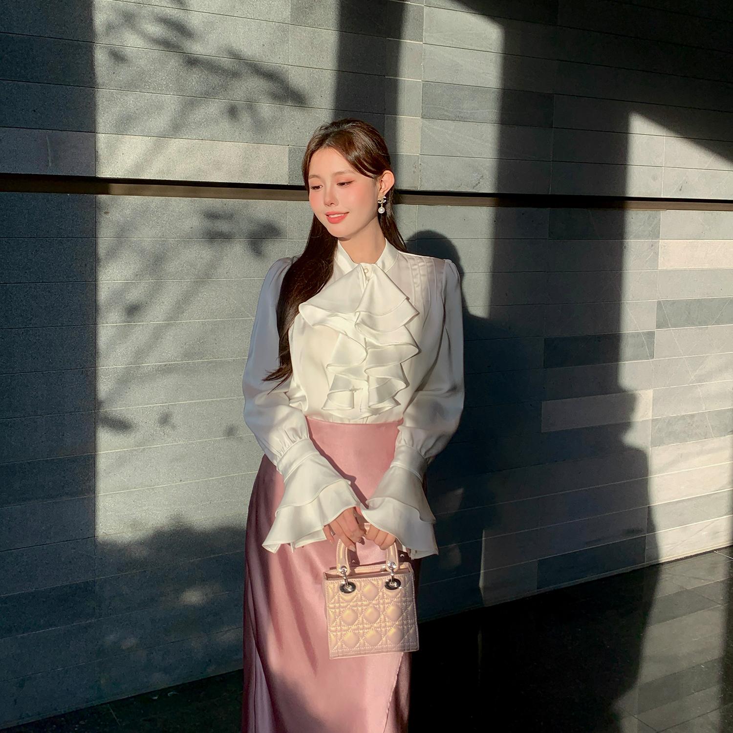 MB大码女装【白塔玫瑰】秋季新款白色花边领衬衫开叉包臀半裙