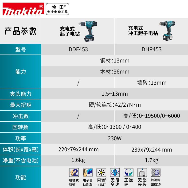 牧田/MAKITA DHP453/DDF453锂电冲击电钻起子机螺丝刀手电钻