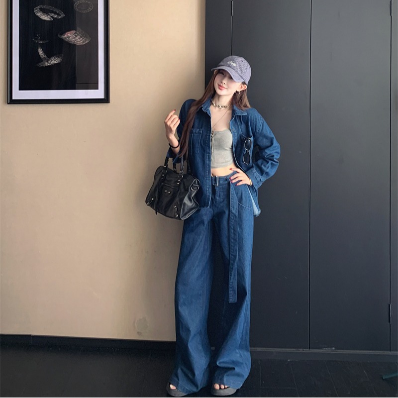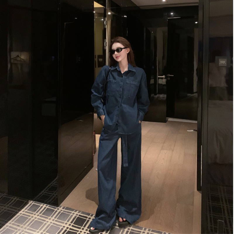 高级感牛仔套装女春秋季新款松弛感气质长袖衬衫高腰阔腿裤两件套