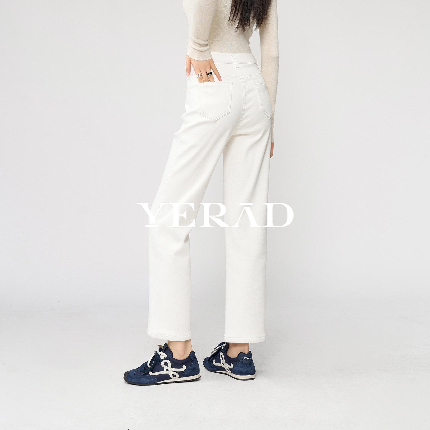 娅丽达加绒牛仔裤女冬2025新款女裤羊毛桑蚕丝九分白色窄版直筒裤