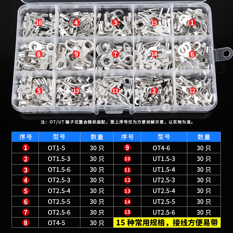 冷压接线端子OT/UT裸端子圆形叉型接线鼻线耳开口铜鼻子15种套装