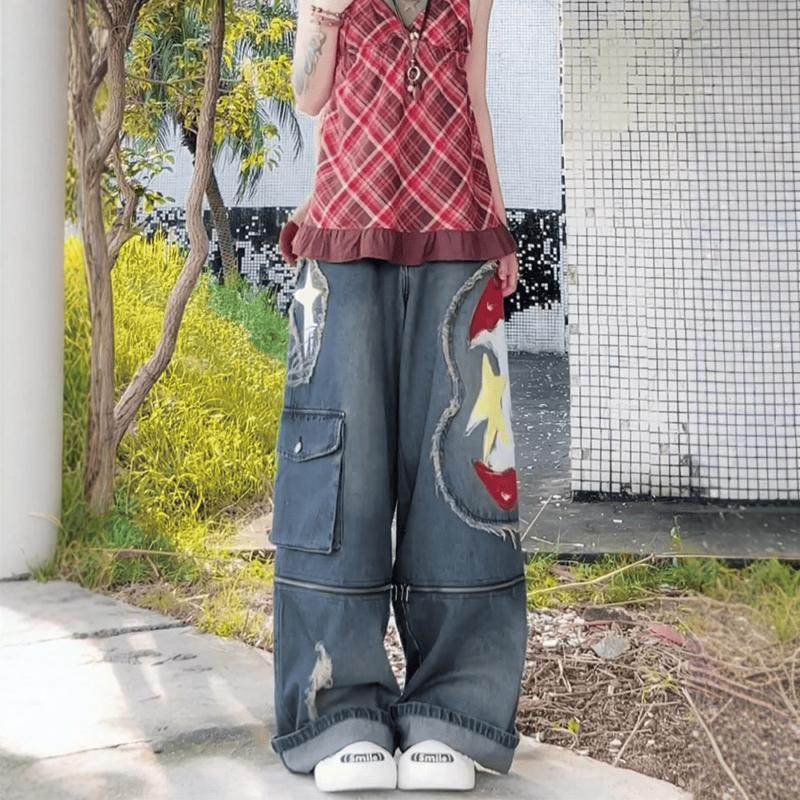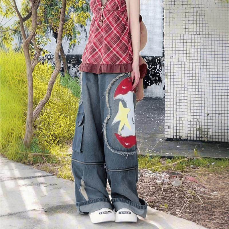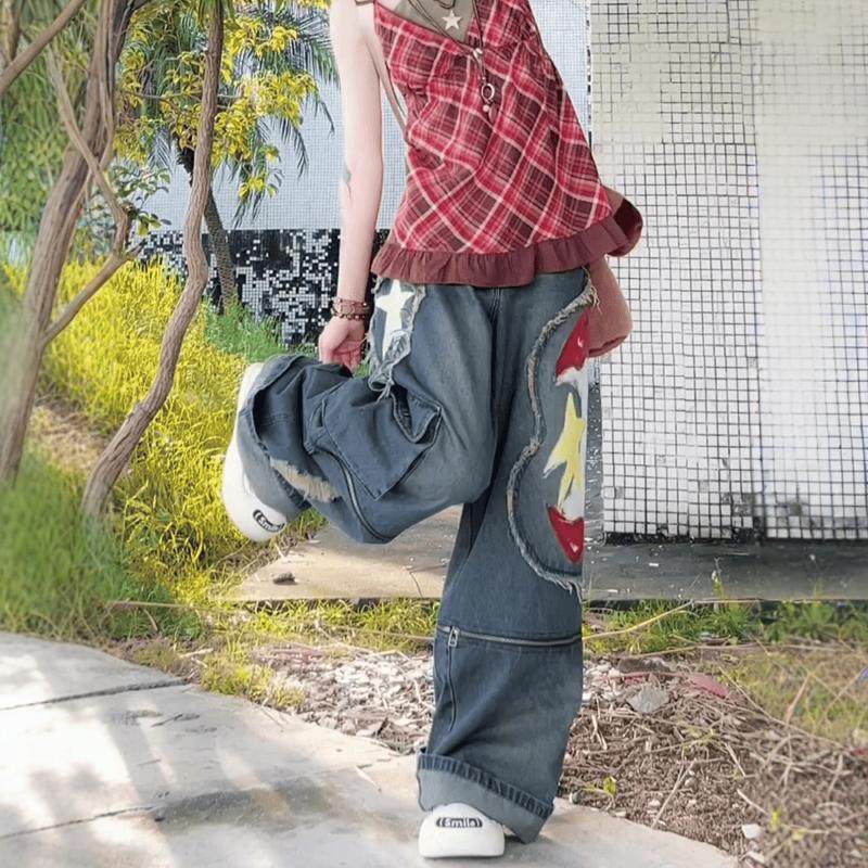 亚比穿搭国潮涂鸦可拆卸阔腿牛仔裤女y2k千禧辣妹七分牛仔短裤ins