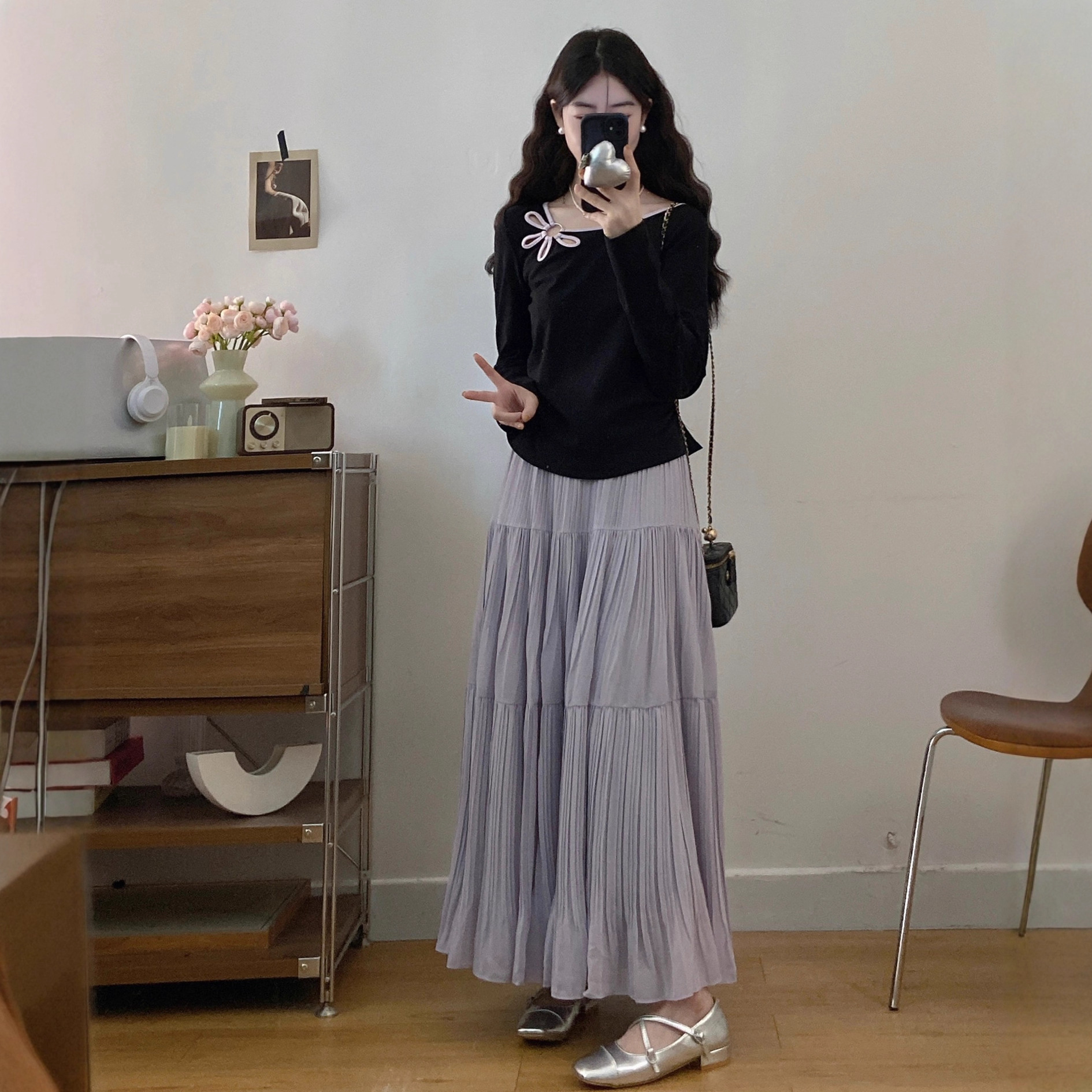2025年秋新款大码镂空花朵正肩黑色长袖t恤上衣搭配百褶长裙套装
