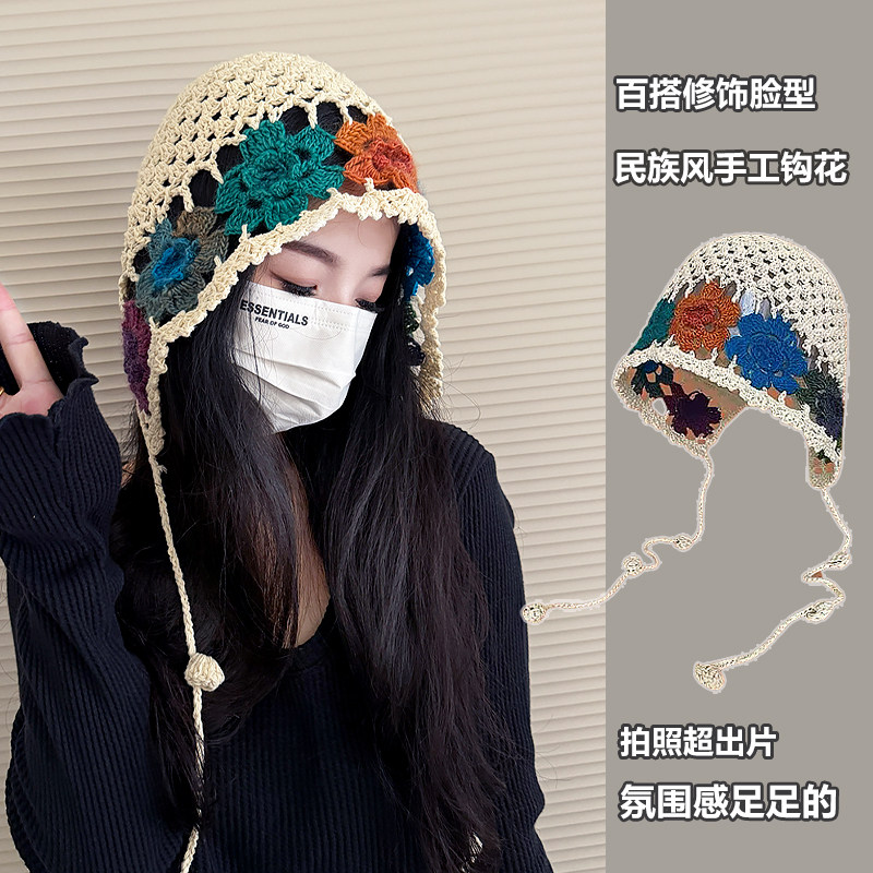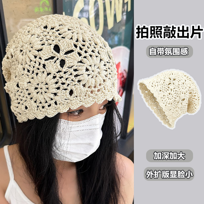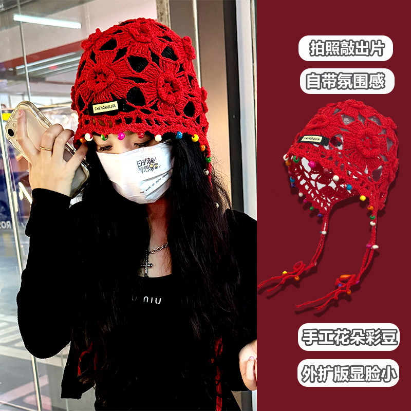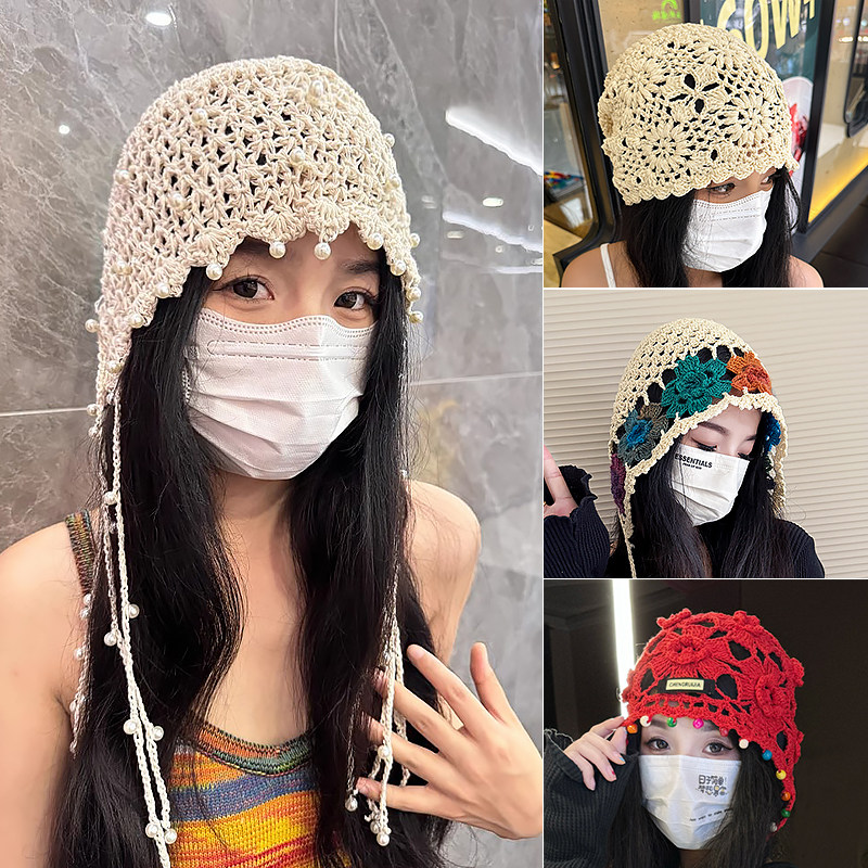手工花朵珍珠流苏镂空包头帽子女夏天薄款编织民族风针织帽堆堆帽