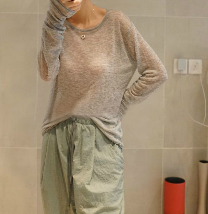 精纺超薄微透低圆领羊绒衫女宽松打底秋季针织羊毛衫套头纯色休闲