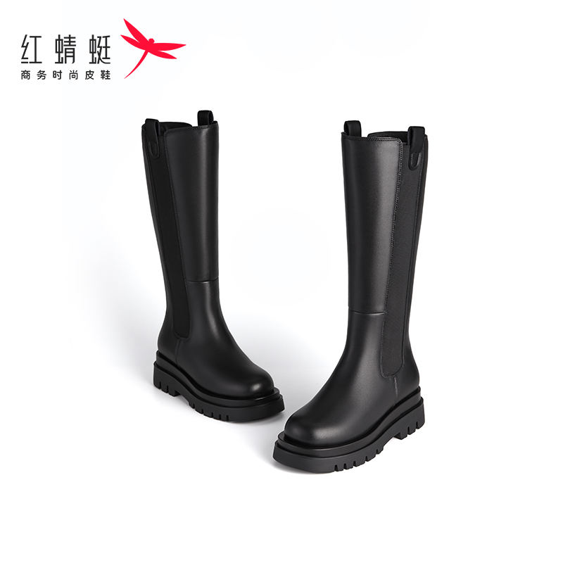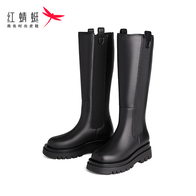 红蜻蜓真皮中筒靴女保暖加绒棉靴厚底防滑高筒靴长靴子 断码清仓