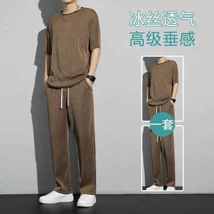 简约男冰丝坠感青少年家居服套装
