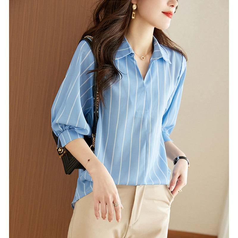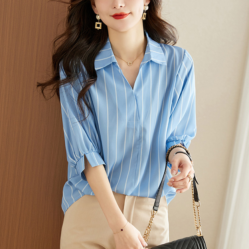 实拍条纹衬衫女七分袖夏季2026新款洋气衬衣女人味别致设计感上衣