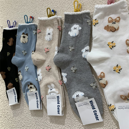 vivid color韩国东大门秋季新款女袜立体植绒卡通小狗花朵中筒袜