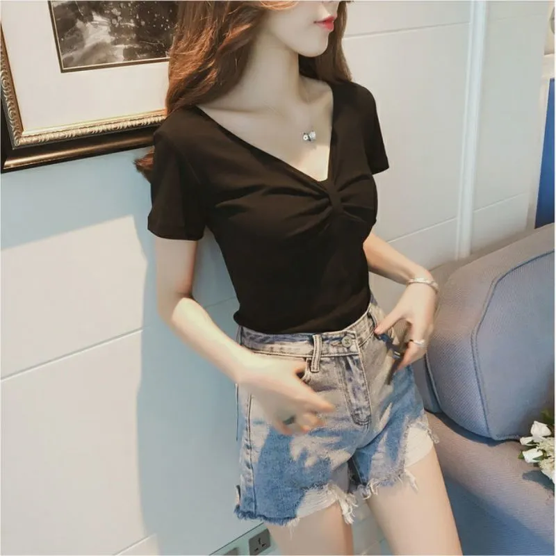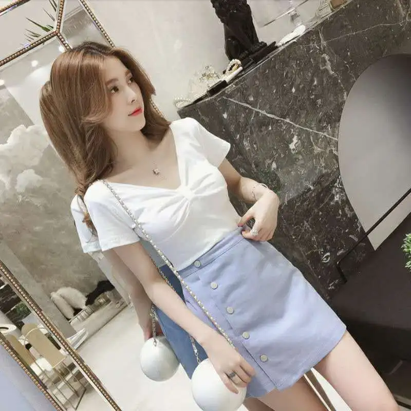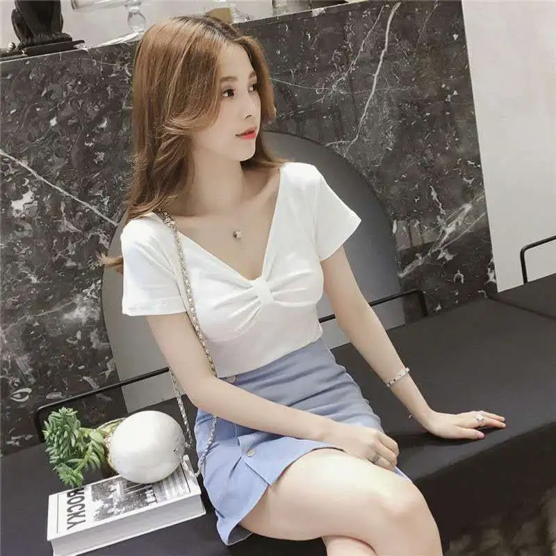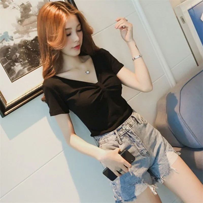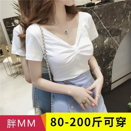 大码女装白色短袖纯棉T恤胖mm夏季新款韩版V领修身显瘦打底衫上衣